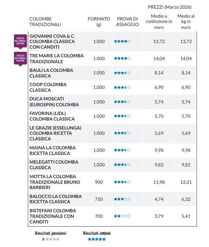 A conquistare il titolo di “Scelte dai consumatori” sono due colombe a pari merito: Giovanni Cova & C. e Tre Marie, entrambe giudicate simili a prodotti fatti a mano, con un impasto morbido e canditi ben equilibrati. Otto colombe hanno ottenuto valutazioni positive ma senza lasciare il segno, mentre due marchi si sono distinti per le performance peggiori. Balocco è risultata poco aromatica e con impasto asciutto, mentre Bistefani, la più economica del test, ha deluso per sapore debole, consistenza secca e canditi scarsi, dimostrando che il risparmio economico può incidere sul piacere del palato.