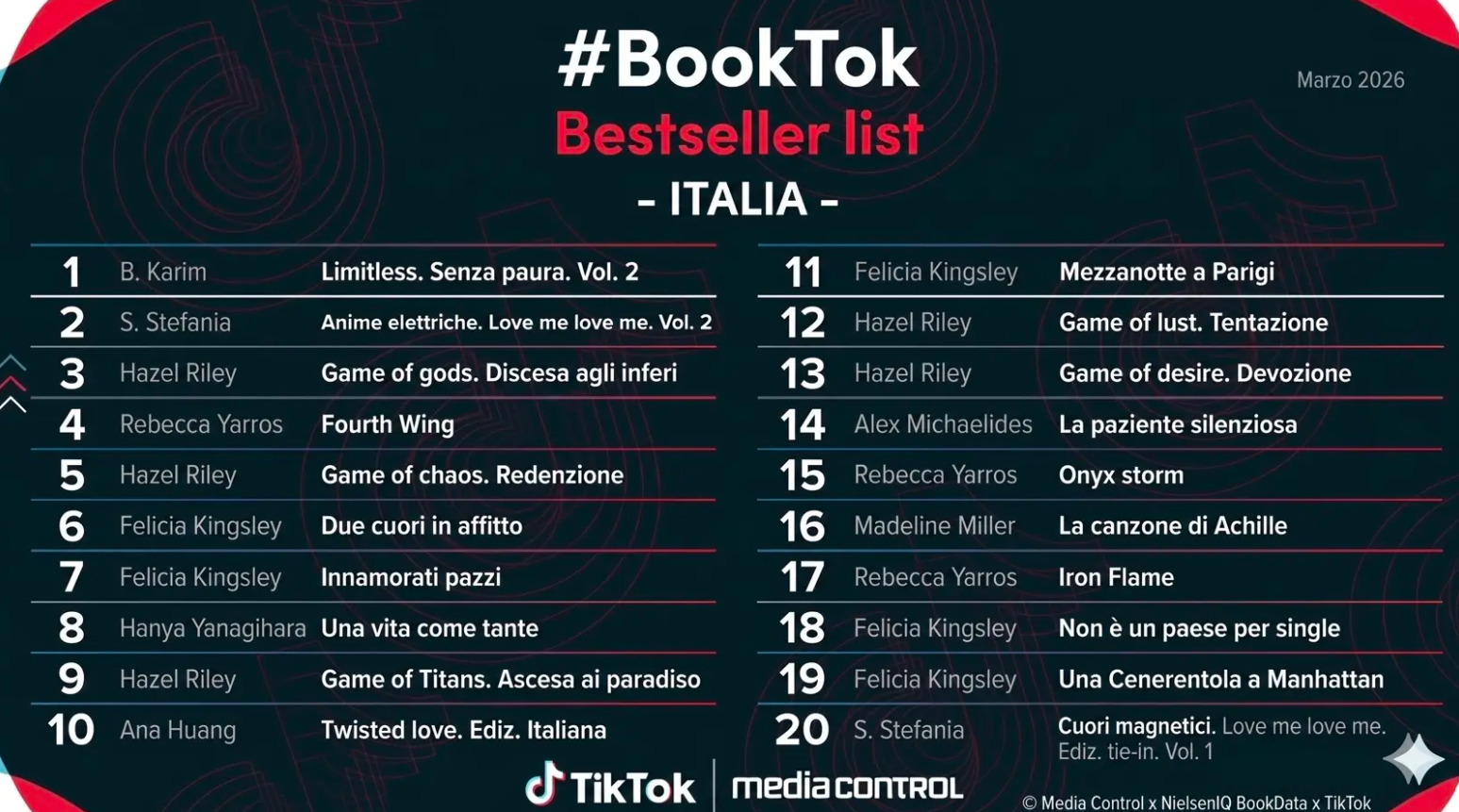 Oltre a Felicia Kingsley, Hazel Riley e Stefania S., emerge anche Karim B., segno che il fenomeno #BookTok non è solo un’onda internazionale, ma un vero e proprio ecosistema creativo radicato nel mercato editoriale italiano.