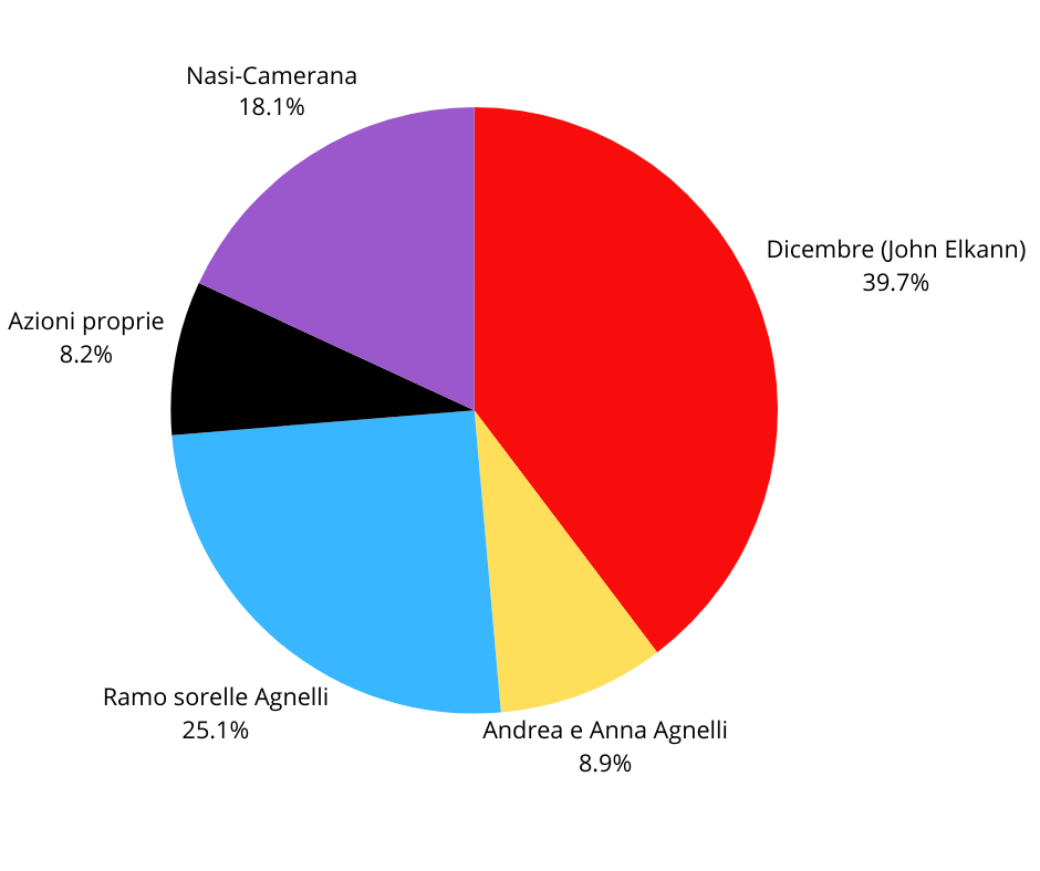 Per aumentare la propria quota, la Dicembre ha acquistato una parte significativa dalle mani degli eredi di Umberto Agnelli. Inizialmente, Andrea Agnelli deteneva l'11,85% delle azioni, rendendolo il secondo azionista. Tuttavia, questa percentuale è scesa all'8,9%, indicando che la Dicembre ha riacquistato il 2,95% delle azioni precedentemente di proprietà di Andrea Agnelli.