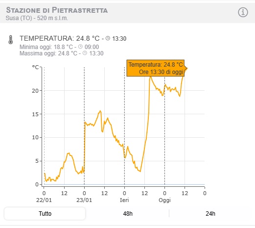 L'anticiclone e il foehn stanno surriscaldando la Val di Susa, in provincia di Torino. Le centraline dell'Arpa Piemonte stanno registrando temperature record, decisamente anomale per la stagione, in particolare a Susa dove la colonnina è salita fino a 24,8 gradi. Ma anche in alta montagna la situazione non è molto migliore: a Bardonecchia ci sono 16,9 gradi, a Sansicario 10, a Sestriere, sul Fraiteve (2.700 metri) ce ne sono 4. E anche in Val Chisone la situazione è simile: più di 14 gradi a Pragelato, qusi 17 a Prà Catinat e più di 16 pure a Pinerolo. A Torino, ai Giardini Reali, siamo fermi a "soli" 13,5 gradi, mentre per trovare lo zero termico è necessario salire fino ai 3mila metri del Sommeiller.
