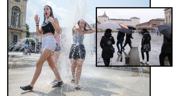 Clima a Torino: le due facce di piazza Castello, con il caldo afoso e la pioggia battente