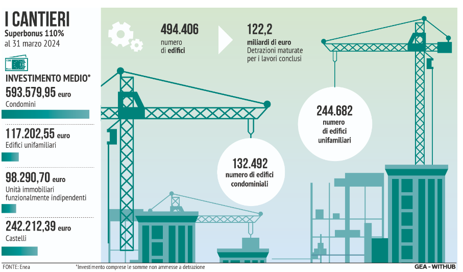 In particolare, i cantieri condominiali sono 132.492 per un investimento complessivo ammesso a detrazione di 78,05 miliardi, che valgono circa il 66,6% del totale. I lavori realizzati rappresentano il 93,7%. I cantieri degli edifici unifamiliari hanno raggiunto quota 244.682 per un investimento complessivo da detrarre di 27,9 miliardi, che valgono circa il 23,8% del totale. I lavori realizzati rappresentano il 98,2%. I cantieri delle unità immobiliari indipendenti hanno raggiunto quota 117.224 per un investimento complessivo ammesso a detrazione di 11,291 miliardi, che valgono circa il 9,6% del totale. I lavori realizzati rappresentano il 98,1%. Restano 8 i castelli che hanno beneficiato del Superbonus per un valore di 1,082 miliardi ammessi a detrazione: lavori ultimati al 90,4%.