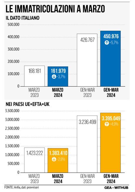Secondo l'Acea, l'associazione dei costruttori europei, le immatricolazioni di auto nuove in Europa hanno visto un calo del 2,8% a marzo 2024 rispetto allo stesso mese dell'anno precedente, con un totale di 1.383.410 veicoli immatricolati. Nonostante questo, il complessivo primo trimestre del 2024 si chiude in positivo (+4,4%), grazie a un buon inizio d'anno, che sfruttava ancora l'effetto degli incentivi dei singoli costruttori nell'anno precedente.