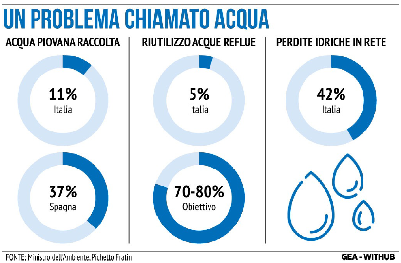 “Noi raccogliamo solo 11% dell'acqua piovana. Paesi come la Spagna ne raccolgono il 37%. Noi utilizziamo solo il 5% delle acque reflue, mentre dovremmo utilizzare almeno il 70-80%" ha insistito Pichetto. E quanto al piano degli invasi, "si va avanti" ma "c'è un percorso decisionale burocratico non brevissimo". "L'Italia - ha spiegato ancora è in una situazione molto difficile. Sono almeno 40 anni che non si fanno strutture e infrastrutture per la tenuta e la regimazione delle acque. Quindi si sta partendo. C'è stato il piano adattamento al cambiamento climatico che indica quelle che sono le azioni, sono tantissime, 361. Certamente l'investimento è colossale, ma sono le azioni che devono portarci nel più breve tempo possibile a portare il Paese a raccogliere le acque quando viene troppa pioggia".