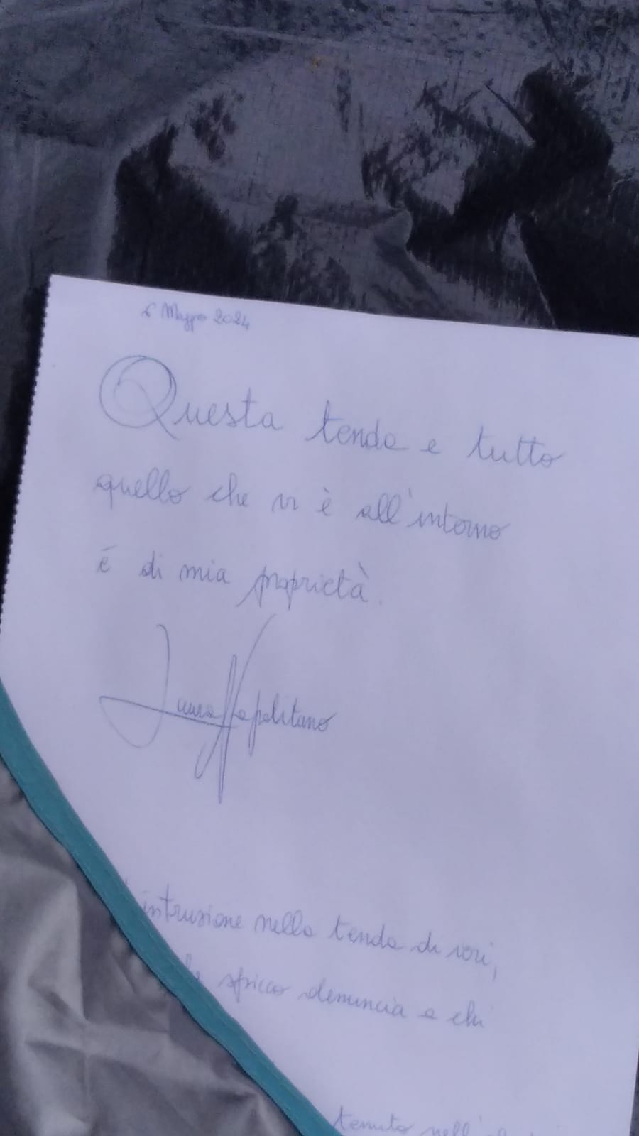 Una tenda da campeggio bianca e verde aperta nel bel mezzo di piazza San Carlo. Sotto ci vive accampata una donna, o almeno così sembra. E', infatti, possibile scorgere un bigliettino scritto a penna. Sopra una data - 6 maggio - e sotto poche righe, ma chiare: "Questa tenda e tutto quello che vi è intorno è di mia proprietà". Con una firma non facile da cogliere, forse Laura.