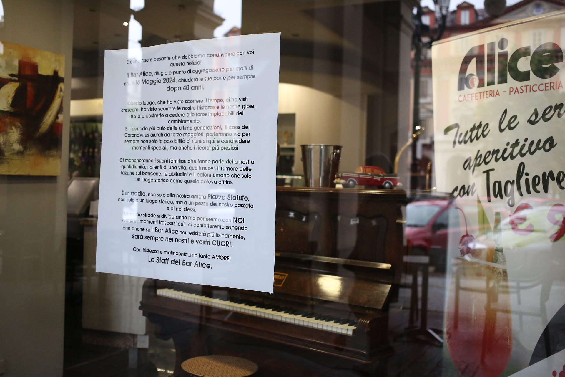 A dare l'annuncio ai clienti, con un manifesto, è stato proprio lo staff del locale che per tanti anni ha fatto da sfondo alle serate di generazioni di torinesi. «E' con il cuore pesante che dobbiamo condividere con voi questa notizia - si legge tra le altre cose nell'avviso firmato "Lo staff del bar Alice" - Il bar Alice il 19 maggio 2024 chiuderà le sue porte per sempre dopo 40 anni».