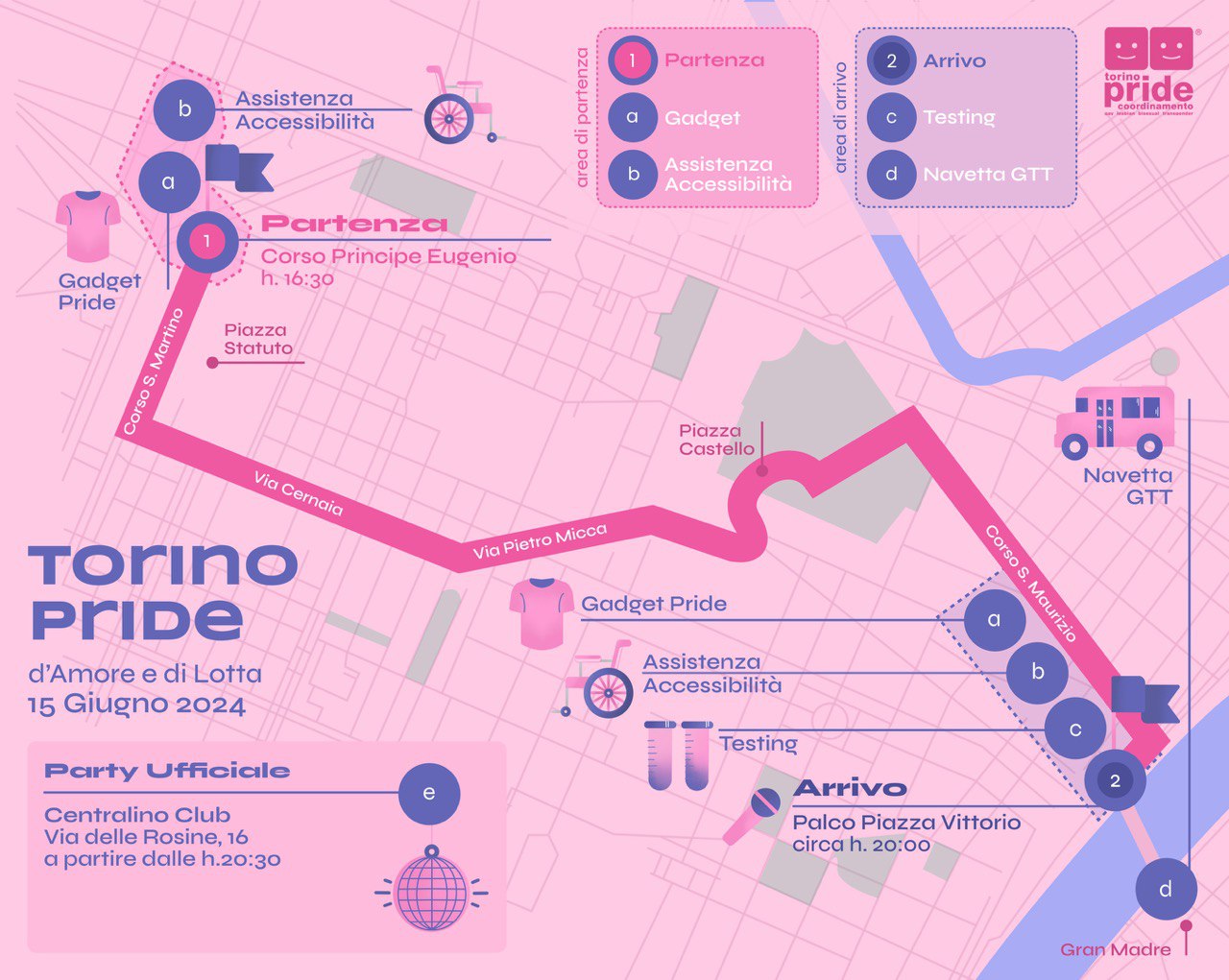 La parata sarà accessibile a tutti grazie alla collaborazione con il Disability Pride Torino e il collettivo Mai Ultimi, Croce Rossa e Gtt. In testa al corteo, per chi ha disabilità motorie è previsto il bus City Sightseeing, oltre che un servizio di navetta all’arrivo per il ritorno alla zona di partenza.