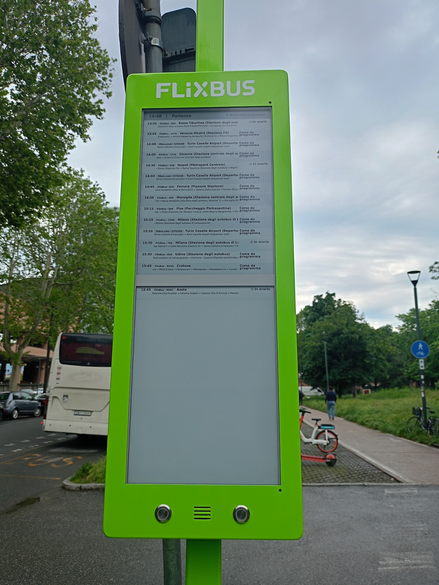 Da oggi le persone in partenza da Torino con FlixBus potranno beneficiare di un nuovo servizio. Presso il terminal autobus di corso Vittorio Emanuele II, che la società degli autobus verdi collega con oltre 200 città in tutta Europa, è in funzione la prima palina digitale, che fornirà ai passeggeri aggiornamenti in tempo reale sul loro viaggio.