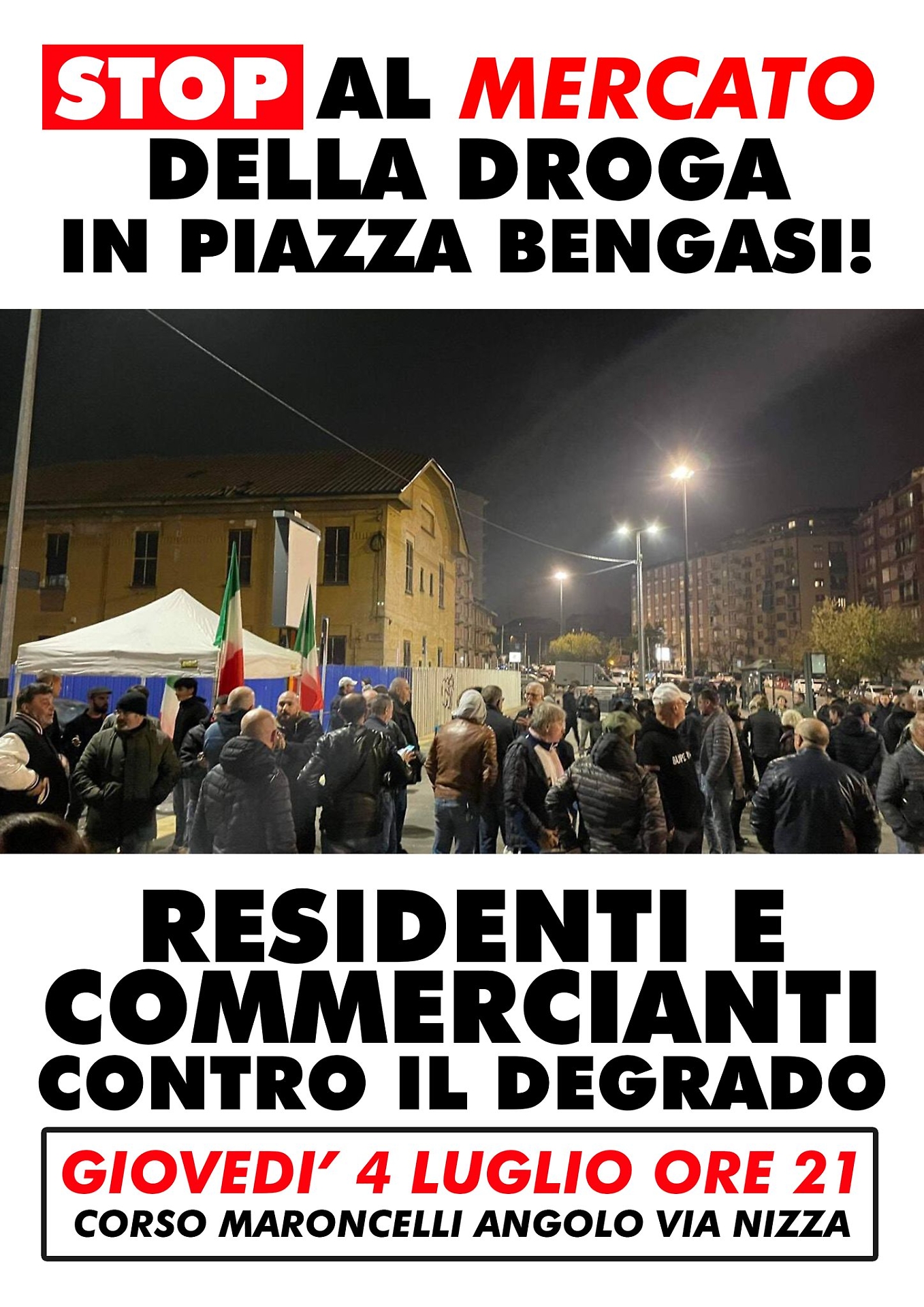 Residenti e commercianti uniscono le forze contro il degrado e lo spaccio in piazza Bengasi. Con lo slogan "Stop al mercato della droga", i cittadini, guidati da Matteo Rossino dei Comitati per Torino, hanno organizzato una protesta che si terrà giovedì 4 luglio alle 21 in corso Maroncelli, angolo via Nizza.