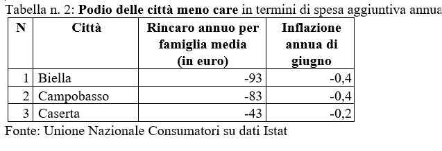 Ma i dati dell'Istat ci consegnano anche una piccola graduatoria delle città più virtuose d'Italia, dove a vincere sono città che sono in deflazione. Al 1° posto Biella dove la deflazione pari a -0,4% si traduce nel maggiore risparmio, pari per una famiglia media a 93 euro su base annua. Medaglia d'argento per Campobasso (-0,4%, -83 euro), seguita da Caserta (-0,2%, -43 euro).