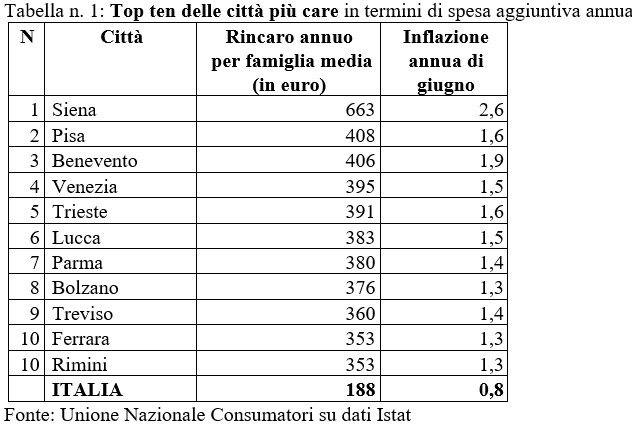 A stilare la classifica, è l'Unione Nazionale Consumatori, basandosi sui dati territoriali dell'inflazione di giugno resi noti dall'Istat. Da qui, ne discende la Top 10 delle città più care d'Italia in termini di aumento del costo della vita. Non solo, quindi, delle città capoluogo di regione o dei comuni con più di 150 mila abitanti ma di tutte le città monitorate dall'Istat.