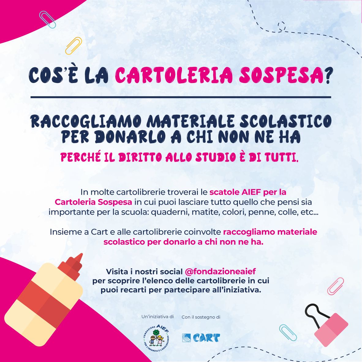 Ha preso il via oggi la quarta edizione della campagna solidale "Cartoleria Sospesa", un'iniziativa promossa dalla Fondazione AIEF per l'infanzia e l'adolescenza, con l'obiettivo di sostenere il diritto allo studio dei bambini che vivono in situazioni di fragilità economica. Quest'anno, 71 cartolibrerie di Torino e provincia hanno aderito all'iniziativa, permettendo ai cittadini di donare materiale scolastico attraverso il metodo della "spesa sospesa".