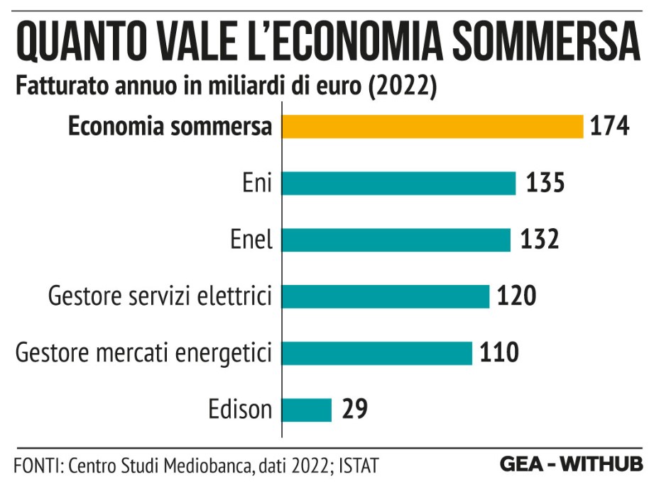 Secondo il Centro Studi di Mediobanca, nel 2022 questa Economia Sommersa Spa ha “fatturato” 174 miliardi di euro. Solo per fare un raffronto, ben visibile nell'infografica qui sopra, Eni - ossia la principale azienda italiana, partecipata dallo Stato - cuba 135 miliardi di euro, Enel 132. Stellantis, che però è una multinazionale, solo per continuare a dare un ordine di grandezza, l’anno scorso ha fatto registrare ricavi per 189 miliardi di euro.