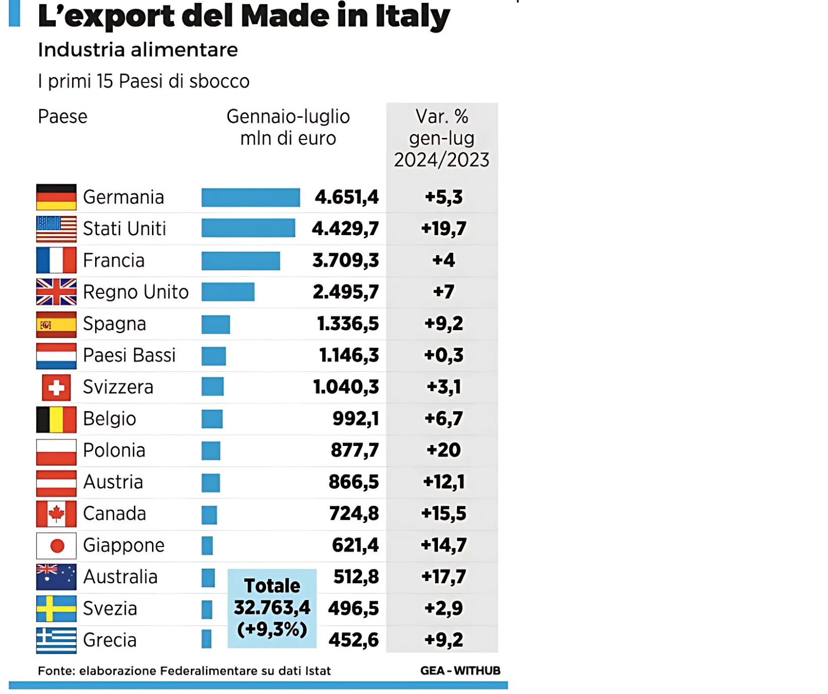 Ma quali sono i Paesi maggiormente conquistati dal Made in Italy? Nella grafica realizzata dall'agenzia Gea, i primi 15 Paesi per sbocco dei nostri prodotti alimentari.