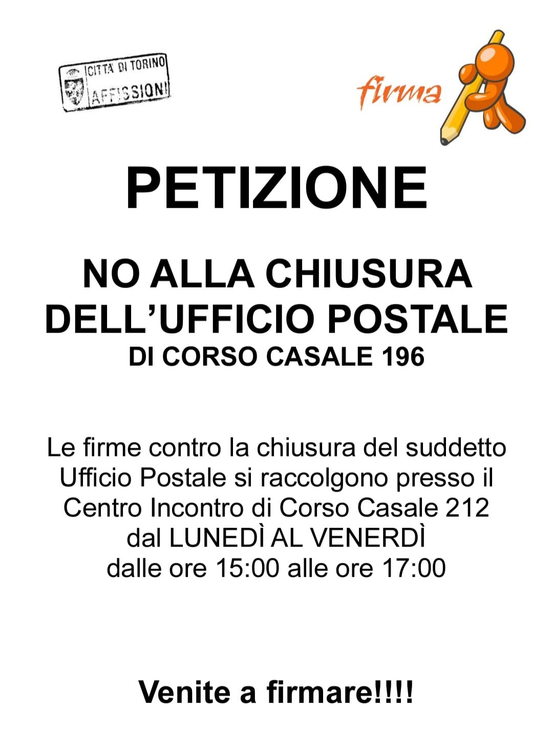 Quello di corso Casale 196 è uno dei cinque uffici postali della città a rischio chiusura. Decisione di Poste Italiane che ha messo in allarme il mondo della politica e i residenti dei vari quartieri (gli uffici in questione si trovano in via Nizza 88 (Torino 55), via Francesco Guicciardini 28 (Torino 13); via Verres 1/A (Torino 78); corso Casale 196 (Torino 53) e via alla Parrocchia 3/A (Torino 54).