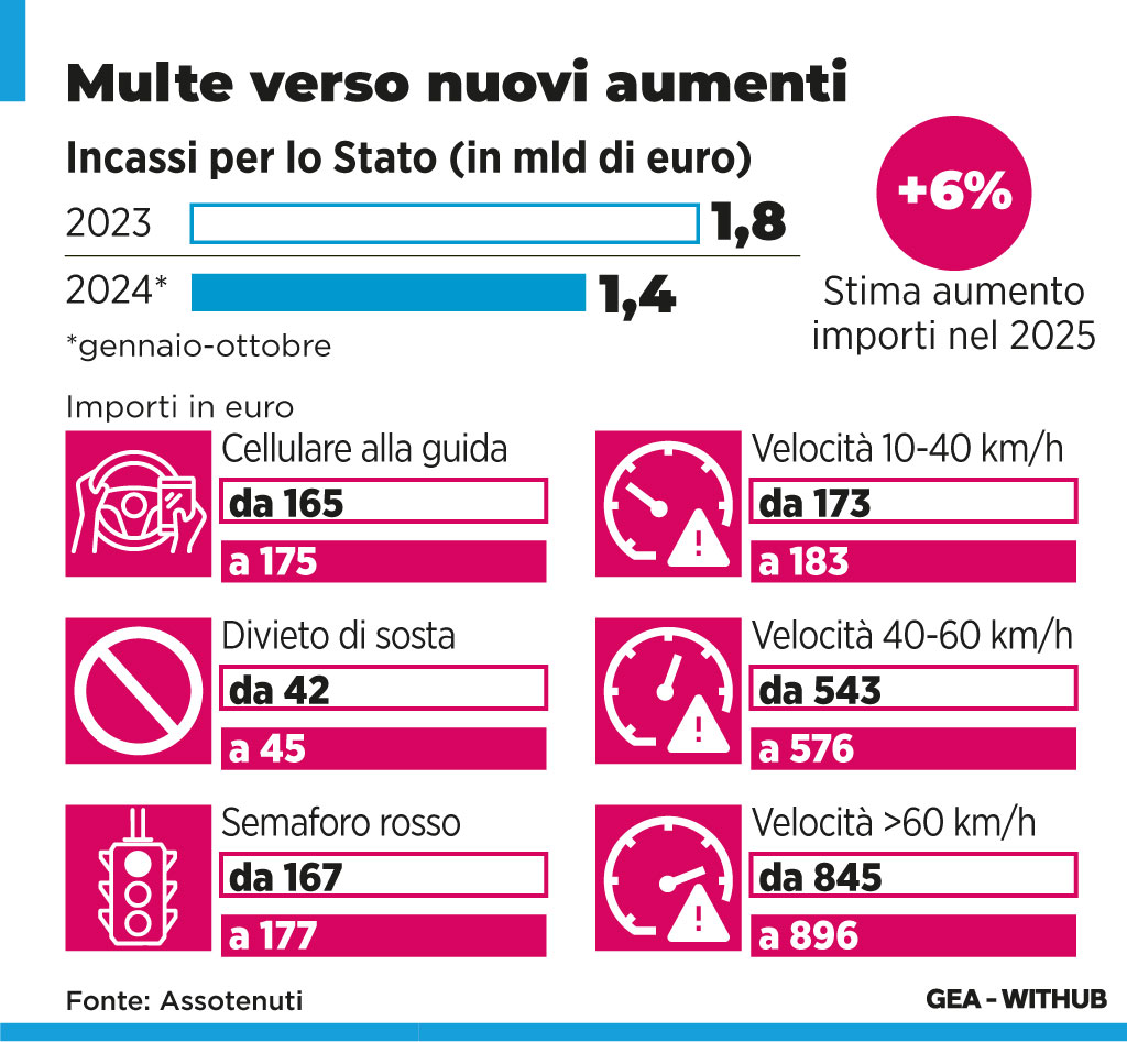 Nel corso del 2023 lo Stato ha incassato circa un miliardo e 800 milioni di euro dalle multe, mentre calcolando i dieci mesi del 2024 siamo già a un miliardo e 400 milioni. Con l'aumento stimato dall'Unione consumatori l'incasso arriverebbe ben oltre i due miliardi di euro.