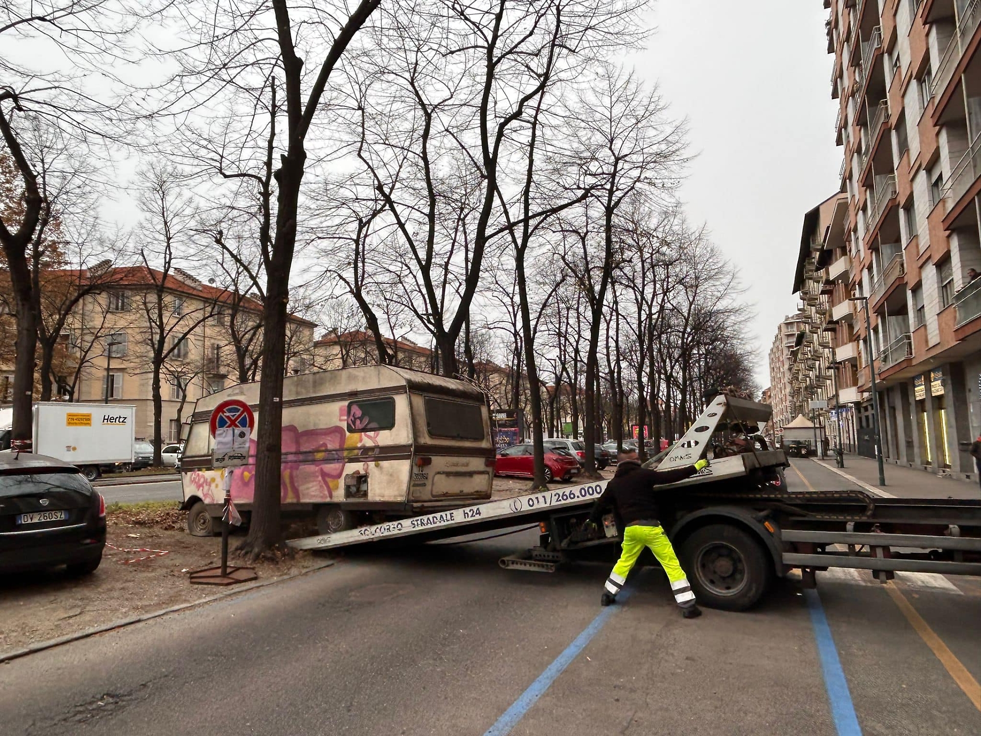 Dopo una telenovela durata la bellezza di 12 anni la roulotte malandata, sporca e inutilizzata di via Rosalino Pilo - angolo corso Lecce - è stata rimossa dal carro attrezzi della polizia municipale, restituendo spazio urbanistico e visibilità ad un tratto di strada che per molto tempo è rimasto inagibile.