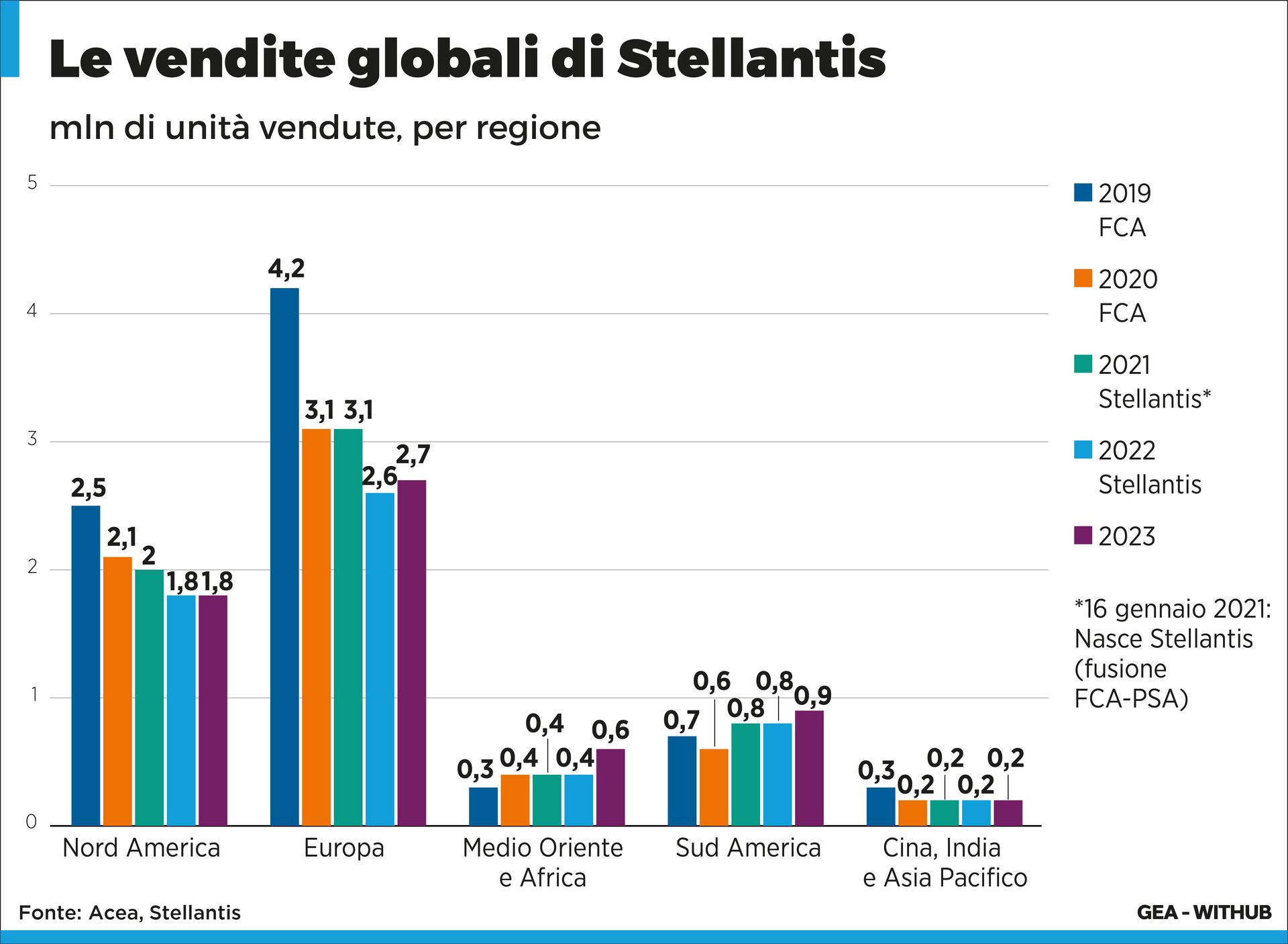 Dati alla mano, si diceva, nel 2019 Fca vendeva in Europa oltre 4,2 milioni di automobili, 3,1 nel 2020. Stellantis, alla sua nascita nel 2021, era a 3,1, per poi scendere a 2,6 nel 2022 e 2,7 nel 2023. In Nord America, si va dai 2,5 di Fca nel 2019 a 1,8 di Stellantis nel 2023. Stellantis di fatto guadagna solo in Medio Oriente, Africa e Sud America, dove però il brand più venduto rimane Fiat.