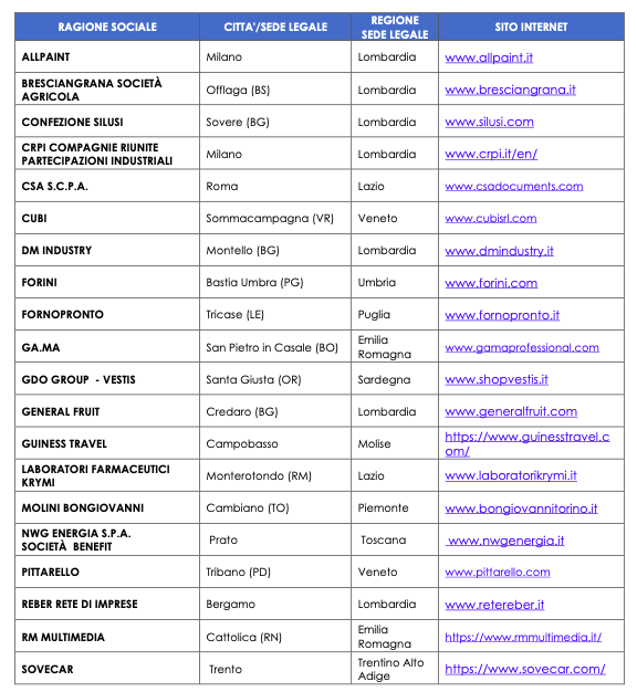 Le 20 PMI selezionate e inserite nel nuovo percorso di accelerazione finanziaria provengono da tutta Italia ed appartengono a diversi settori industriali tra cui l’agroalimentare, l’edilizia, il turismo e l’abbigliamento. L’ iter formativo prevede moduli di approfondimento trasversali su sviluppo e crescita dell’impresa attraverso innovazione tecnologica, internazionalizzazione, sostenibilità, buona governance e reperimento delle giuste risorse finanziarie.