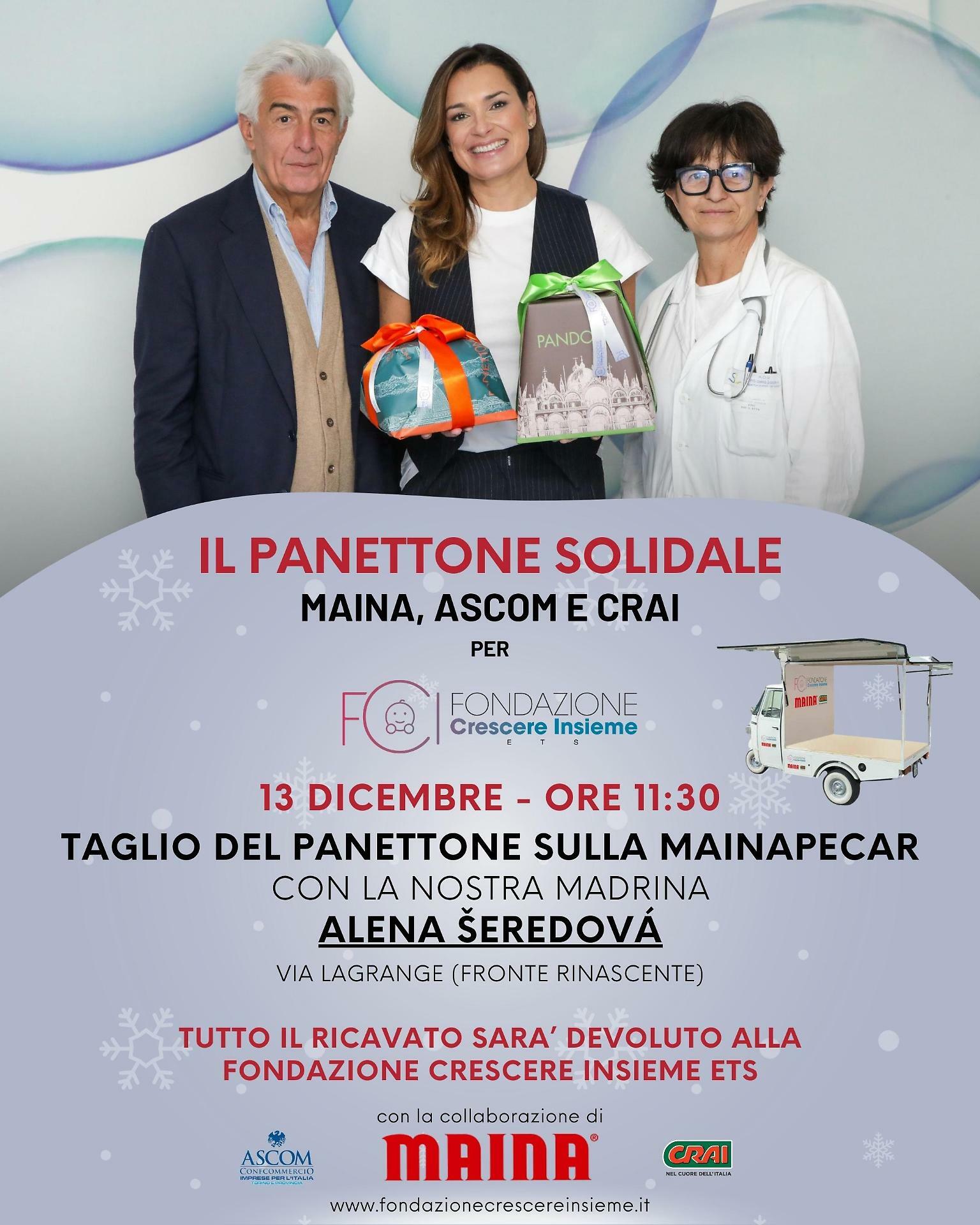 Grande festa domani, venerdì 13 dicembre, a Torino: in via Lagrange - fronte Rinascente- alle ore 11.30, Alena Seredova farà il primo taglio al mega panettone offerto da "Maina". Il ricavato sarà devoluto alla Fondazione “Crescere Insieme Onlus” per i bambini prematuri del Reparto di Terapia Intensiva Neonatale dell’Ospedale Sant’Anna di Torino.