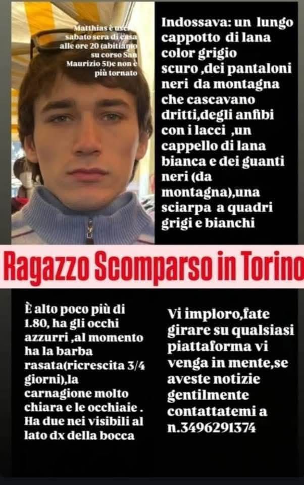 Ieri le unità cinofile sono state coinvolte nelle ricerche, ma, come accennato, le difficili condizioni meteo hanno interrotto le operazioni. Tuttavia, un segnale importante è emerso: pare che domenica mattina, alle 6, l'ultima traccia telefonica di Matthias sia stata registrata in via Roma, vicino alla stazione di Torino Porta Nuova. Nonostante ciò, le persone vicine al giovane escludono l'ipotesi che possa aver lasciato la città di sua iniziativa. Le ricerche proseguono, ma la speranza inizia a cedere il passo all’angoscia. In questo momento difficile, anche la madre di Matthias, arrivata da Mogliano Veneto, è a Torino per unirsi alle ricerche. Insieme a Sveva, lancia un accorato appello: "Preghiamo chiunque lo abbia visto di chiamare i carabinieri, abbiamo bisogno di sapere che sta bene", chiedono disperate. La giovane fidanzata ha poi aggiunto: "Matthias, se ci leggi, per favore fatti vivo."
