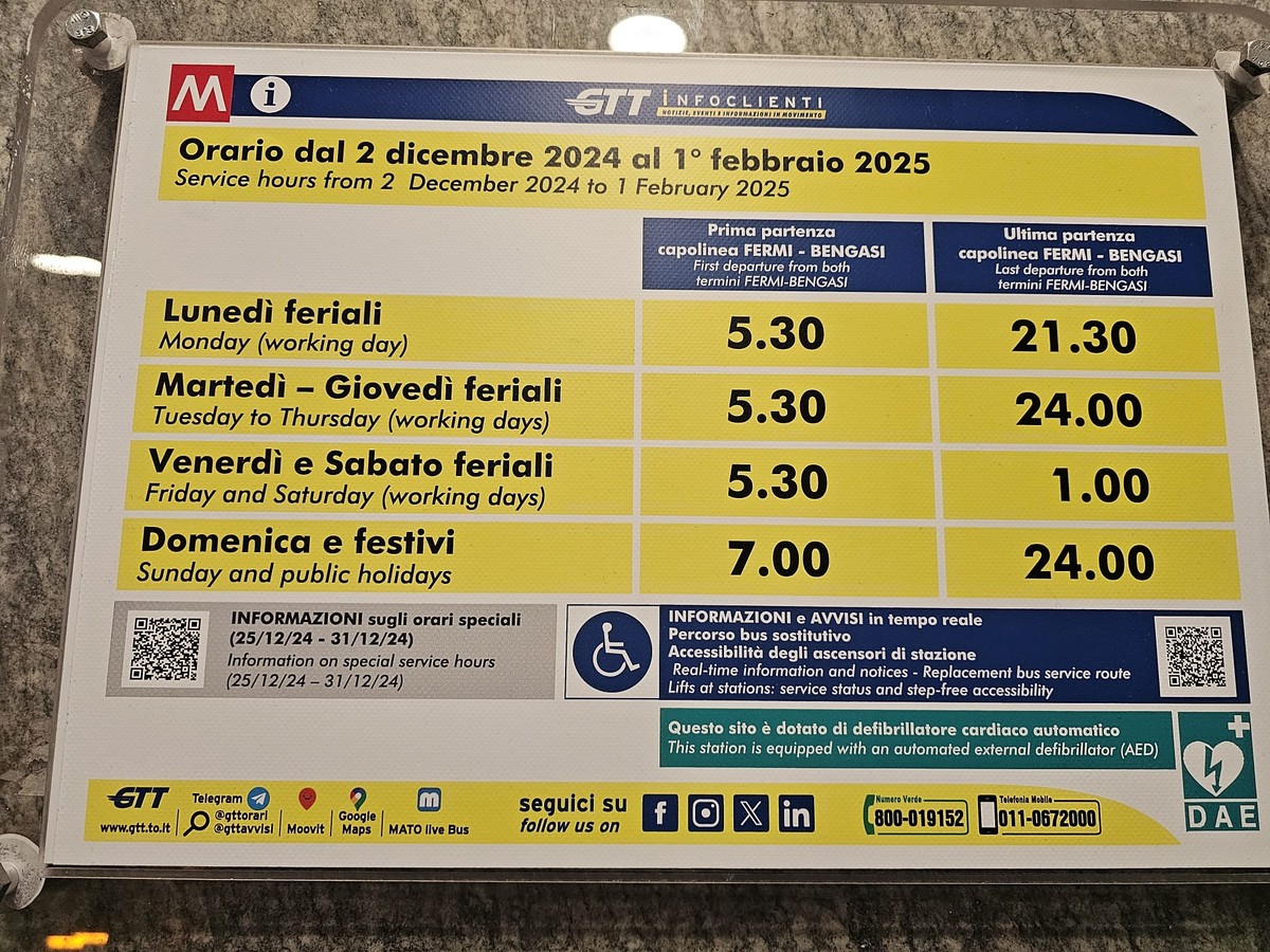 Dopo due mesi di servizio prolungato fino a mezzanotte, e in alcuni casi oltre, la linea 1 tornerà alla chiusura anticipata a partire dal 1 febbraio. I cartelloni informativi, visibili in tutte le stazioni da Fermi a Bengasi, lo confermano: da domenica 2 febbraio, i convogli si fermeranno prima del solito.