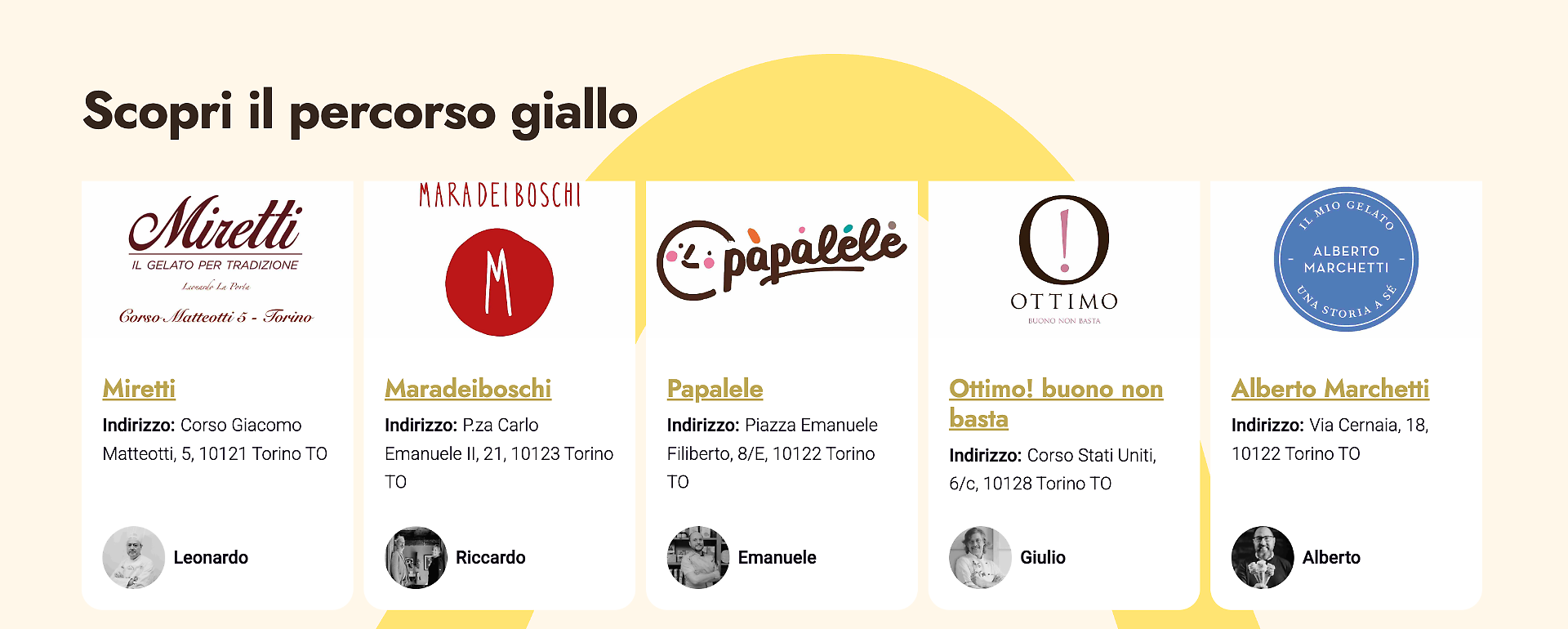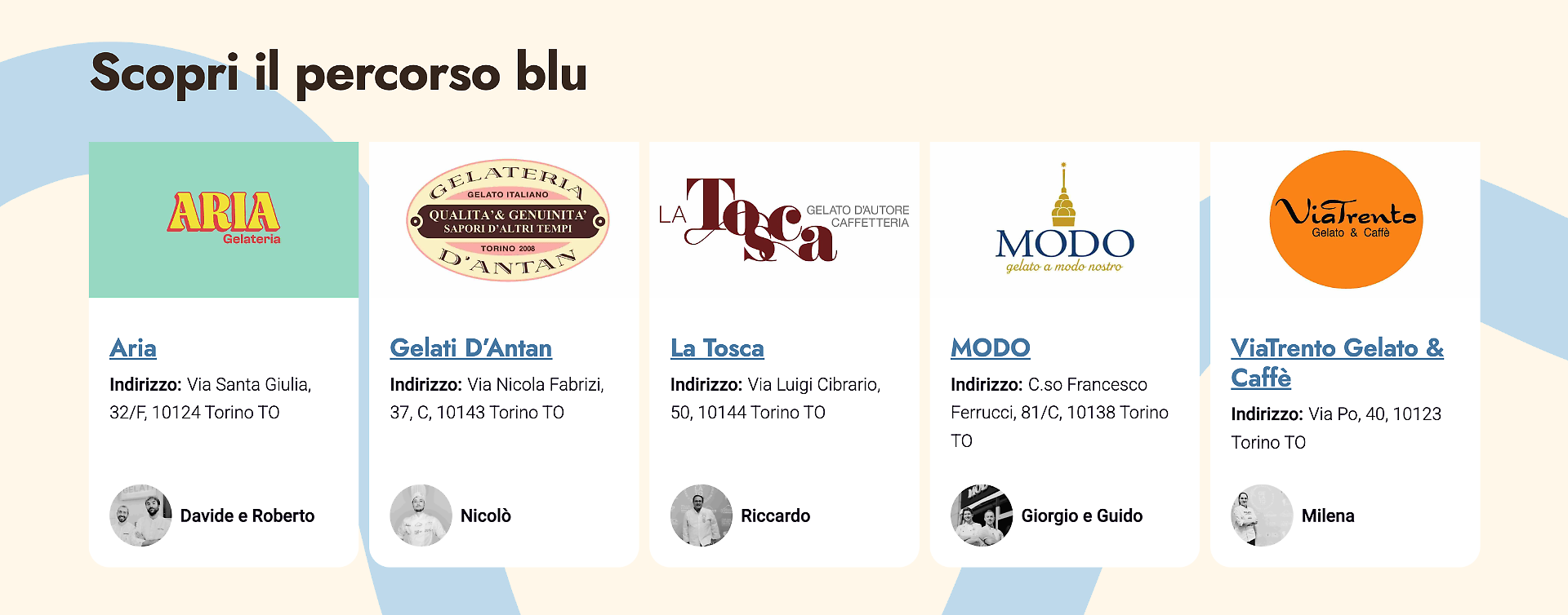 Un format originale e coinvolgente: un percorso a tappe attraverso le gelaterie più rinomate di Torino, suddiviso in due itinerari tematici ispirati ai colori simbolo della città: il Giallo e il Blu. Ogni percorso include la visita a cinque gelaterie, accuratamente selezionate per la qualità dei loro prodotti e l’originalità delle loro proposte. Ecco quali.