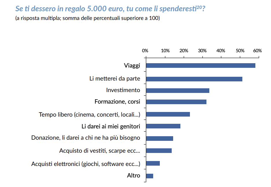 La risposta più diffusa tra gli intervistati riguarda i viaggi "a conferma di una generazione che si vive, e si vede anche nel futuro, come molto mobile sui territori - annotano i ricercatori -, subito dopo emergono opzioni che vanno appunto nella direzione della responsabilità e della cautela, di fronte a un futuro percepito da molti come incerto: risparmiare i 5.000 euro (“li metterei da parte”), effettuare investimenti finanziari o spenderli in percorsi formativi; ben dopo, tra le opzioni indicate dagli intervistati, vengono quelle relative a una spesa immediata del denaro ricevuto in regalo (in divertimenti, cultura, acquisti di abbigliamento o di prodotti elettronici)".