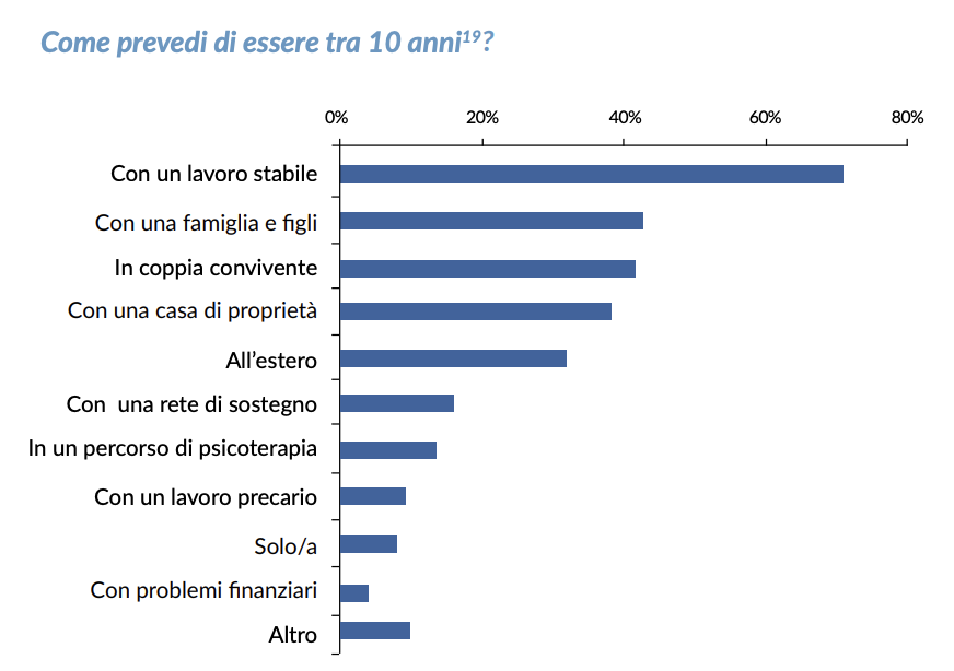 Di fronte alle proprie sfide personali, molte risposte hanno evidenziato preoccupazioni riguardanti l'incertezza del futuro, in particolare quello lavorativo, il desiderio di stabilizzare la propria esistenza, nonché le difficoltà nelle relazioni interpersonali e nelle amicizie, e la complessa gestione tra vita privata e professionale. La maggioranza degli intervistati immagina, tra dieci anni, di avere un impiego stabile, soprattutto coloro che sono già occupati o possiedono un elevato grado di istruzione. Inoltre, un terzo del campione prevede di trasferirsi all'estero; questo dato riguarda principalmente i giovani sotto i vent'anni, coloro con un livello di istruzione inferiore e i disoccupati.