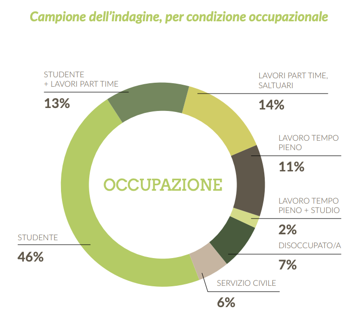 Nella ricerca sono stati intervistati in tutto 219 giovani, in lieve prevalenza ragazze (54%), appartenenti a tre fasce d’età: 14-19enni (pari al 34%), 20-24enni (30%) e 25-29enni (36%), delle province di Torino e Cuneo. Spiega il rapporto che "Pochi lavorano a tempo pieno (13%), negli altri casi si tratta di giovani semi-occupati (34%) o più spesso (53%) non occupati. Di conseguenza, è minoritaria (21% circa) la quota di giovani già usciti dalla famiglia d’origine, che vivono oggi da soli/e oppure in un proprio nucleo".