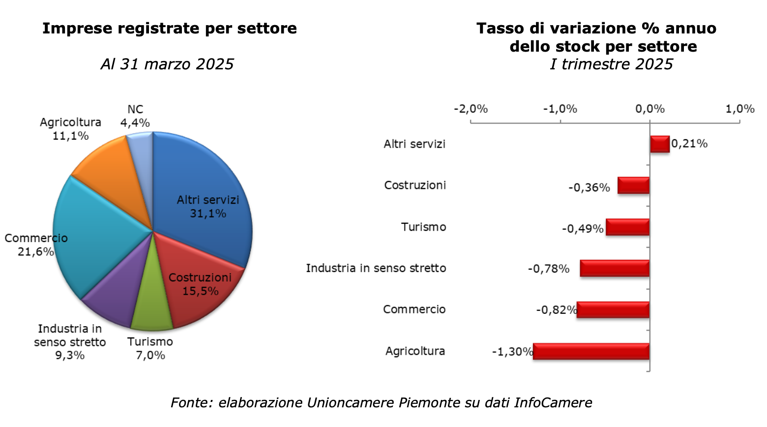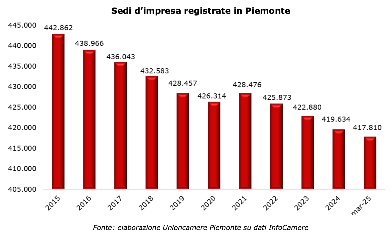 Alla fine di marzo 2025, lo stock complessivo di imprese registrate in Piemonte è pari a 417.810 unità, il 7,1% del totale nazionale, che conferma la regione al settimo posto in Italia.