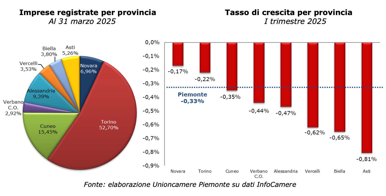La provincia di Torino concentra il 52,7% delle sedi d’impresa in Piemonte, seguita da Cuneo (15,45%) e Alessandria (9,39%). Le altre province (Novara, Asti, Biella, Vercelli, Verbano-Cusio-Ossola) seguono con quote minori.