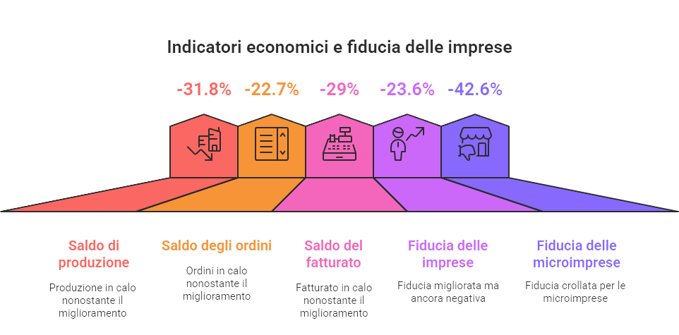 Il portafoglio ordini mostra segnali di miglioramento e, seppur debolmente, ripartono anche alcuni investimenti considerati economicamente rilevanti. Tuttavia, il clima resta non dei migliori: il saldo relativo alla produzione è ancora a -31,8%, quello sugli ordini a -22,7% e il fatturato a -29%. Il grado di fiducia degli imprenditori migliora leggermente, passando da -28,1% (dicembre 2024) a -23,6%, ma resta in territorio fortemente negativo. Tra i più penalizzati ci sono le microimprese (fino a 9 dipendenti) e le aziende della metallurgia, per le quali l’indice di fiducia crolla al -42,6%.