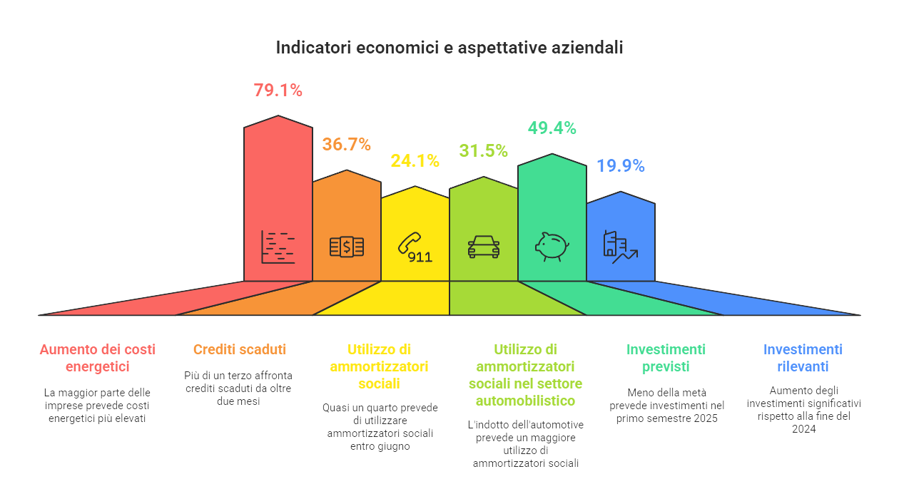 “Le aspettative restano negative, ma meno di quanto temuto qualche mese fa. È una tregua, non ancora una ripresa”, spiega Fabio Schena, responsabile dell’Ufficio Studi. Il 79,1% degli imprenditori segnala un incremento del costo dell’energia rispetto al 2024, mentre il 36,7% denuncia crediti scaduti da oltre due mesi. Sul fronte occupazionale, il 24,1% delle imprese prevede di dover ricorrere ad ammortizzatori sociali entro giugno, con punte del 31,5% nell’indotto dell’automotive. Anche sul fronte degli investimenti, la situazione resta debole: solo il 49,4% delle imprese ha investito o prevede di farlo nel primo semestre 2025. Va però registrato un dato in controtendenza: cresce la quota di investimenti “rilevanti”, che passa al 19,9%, in miglioramento rispetto al 15,4% di fine 2024.
