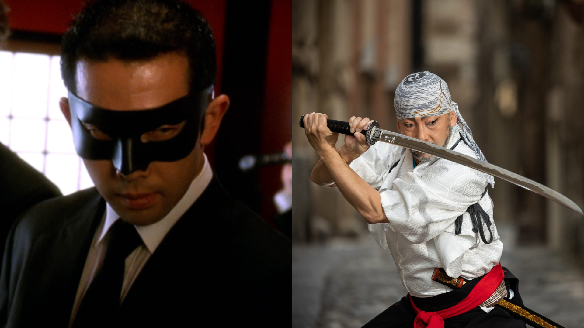 Tetsuro Shimaguchi in Kill Bill (six) e oggi (dex)