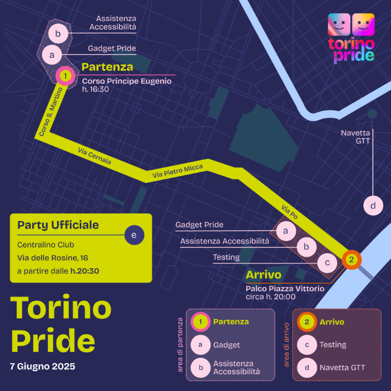 Consulta la Mappa del percorso Torino Pride 2025. Sulla mappa interattiva sono, inoltre, segnalati le panchine, punti smat e bagni pubblici che si trovano lungo l'itinerario.