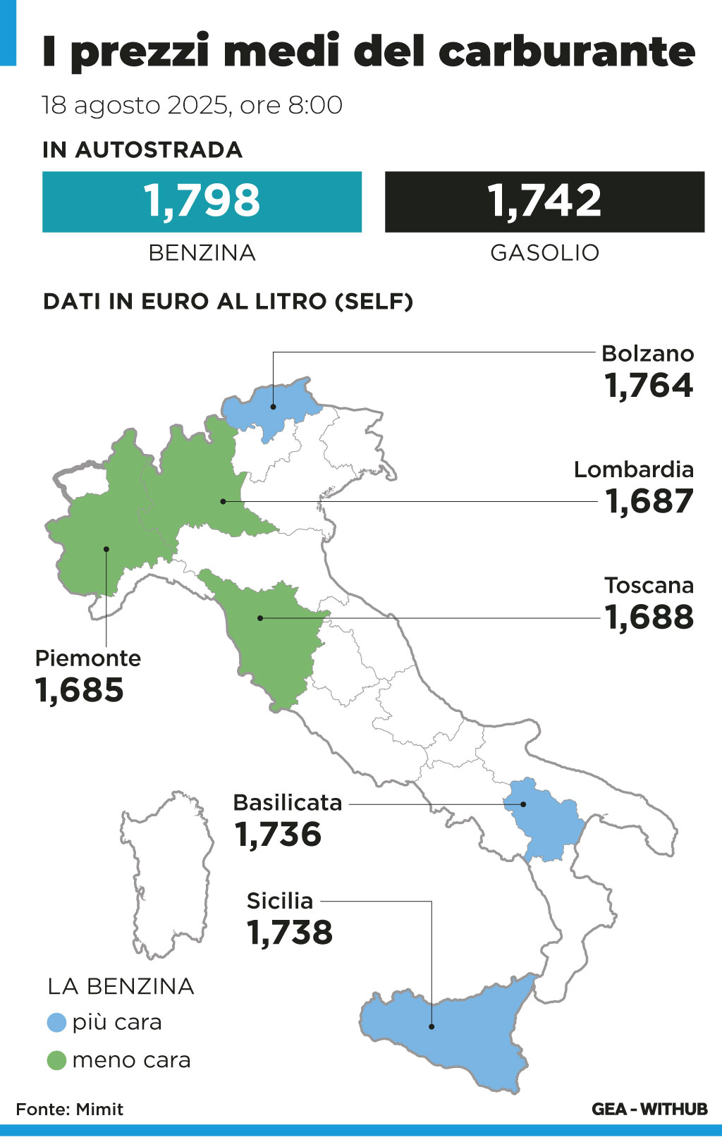 Come si vede nell’infografica di GEA, qui sopra, con i prezzi medi comunicati dal Ministero delle imprese e del Made in Italy (Mimit), oggi in autostrada il valore medio della benzina scende a 1,798 euro/litro, mentre quello del gasolio a 1,742 euro.