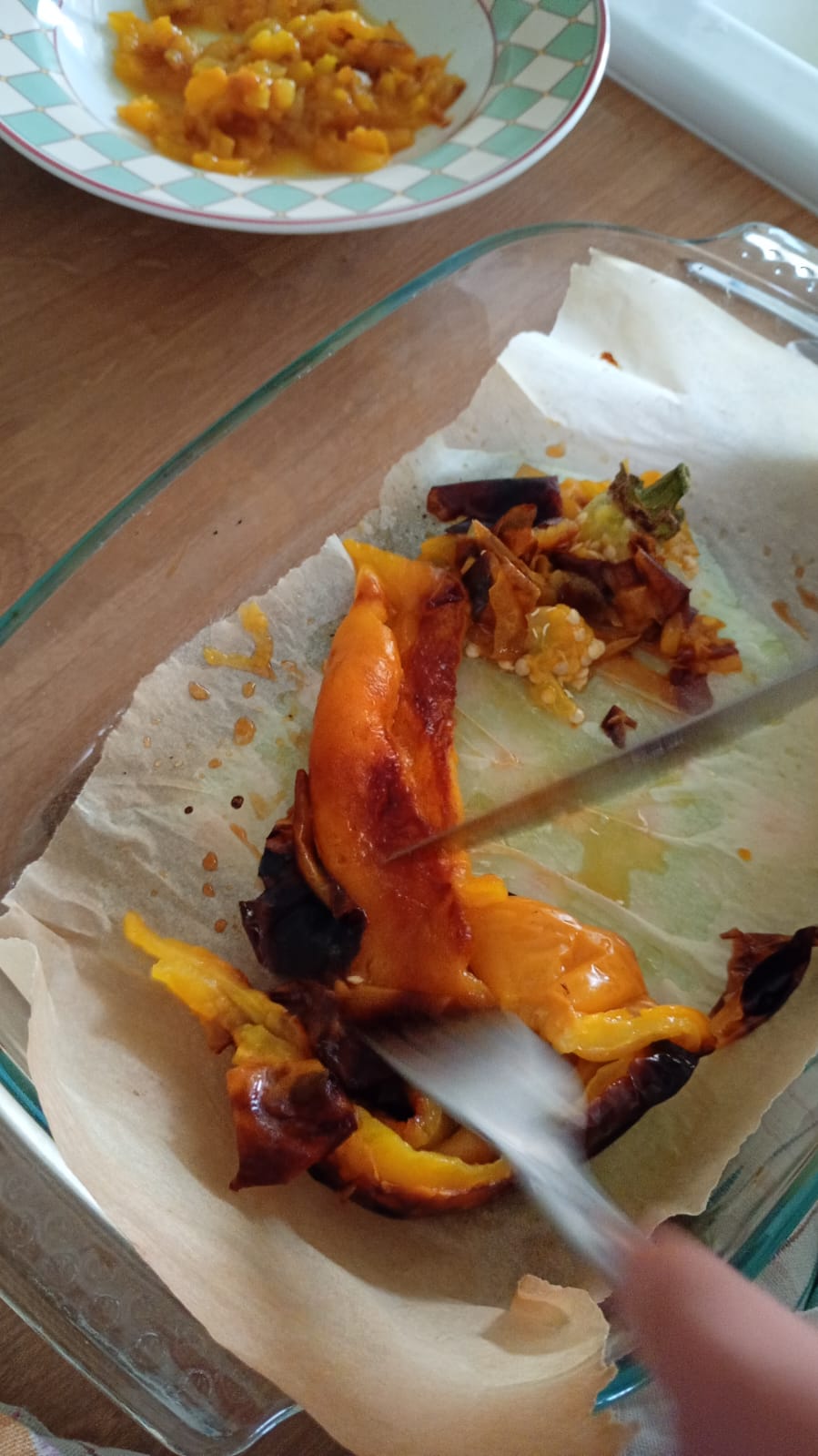 Per prima cosa, pensiamo ai nostri peperoni, meglio se di colori diversi. Vanno arrostiti in forno a 200 gradi per una mezz'ora abbondante. Dopo di che, vanno "sbollentati" sotto l'acqua, per togliere la pellicina. Poi, si tagliano in due per togliere i semini prima di tagliarli a listarelle o tocchetti quadrati.
