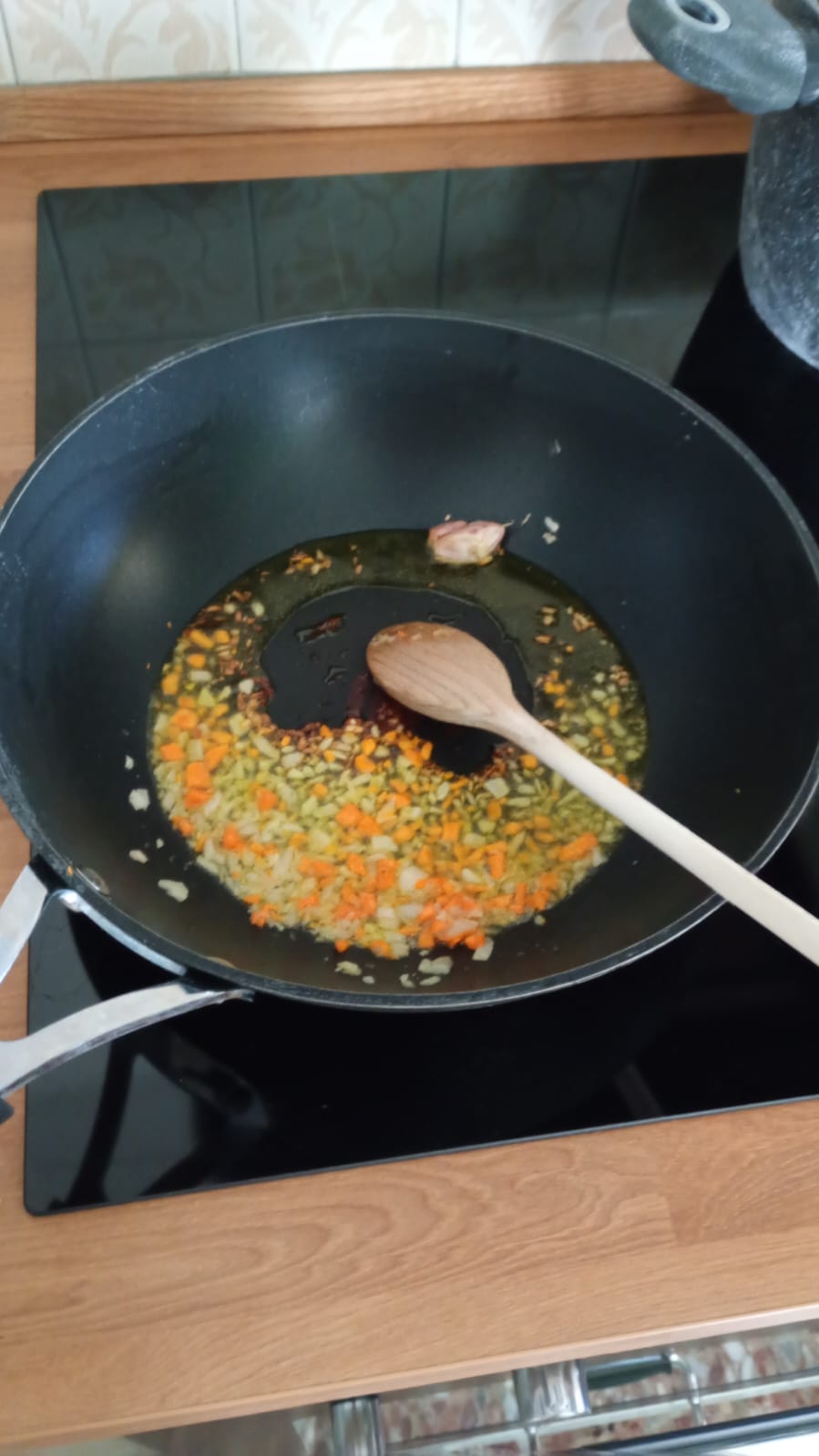 Cominciamo a preparare la base del soffritto: in un wok mettiamo olio d'oliva extravergine - tre o quattro cucchiai vanno benissimo -, assieme allo scalogno tritato finemente (sempre bene usare una mandolina, o mezzaluna). Appena comincia a dorare, aggiungiamo gli spicchi d'aglio in camicia, il mezzo peperoncino e la carota, anche questa tritata bene.