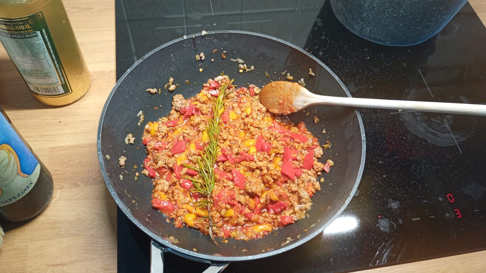 Questo è il momento per aggiungere i nostri peperoni, assieme al concentrato di pomodoro e, ancora, a un filo d'olio. Mescoliamo bene, lasciando cuocere a fuoco moderato (o potenza media nel caso del piano a induzione) e aggiungiamo un rametto di rosmarino fresco.