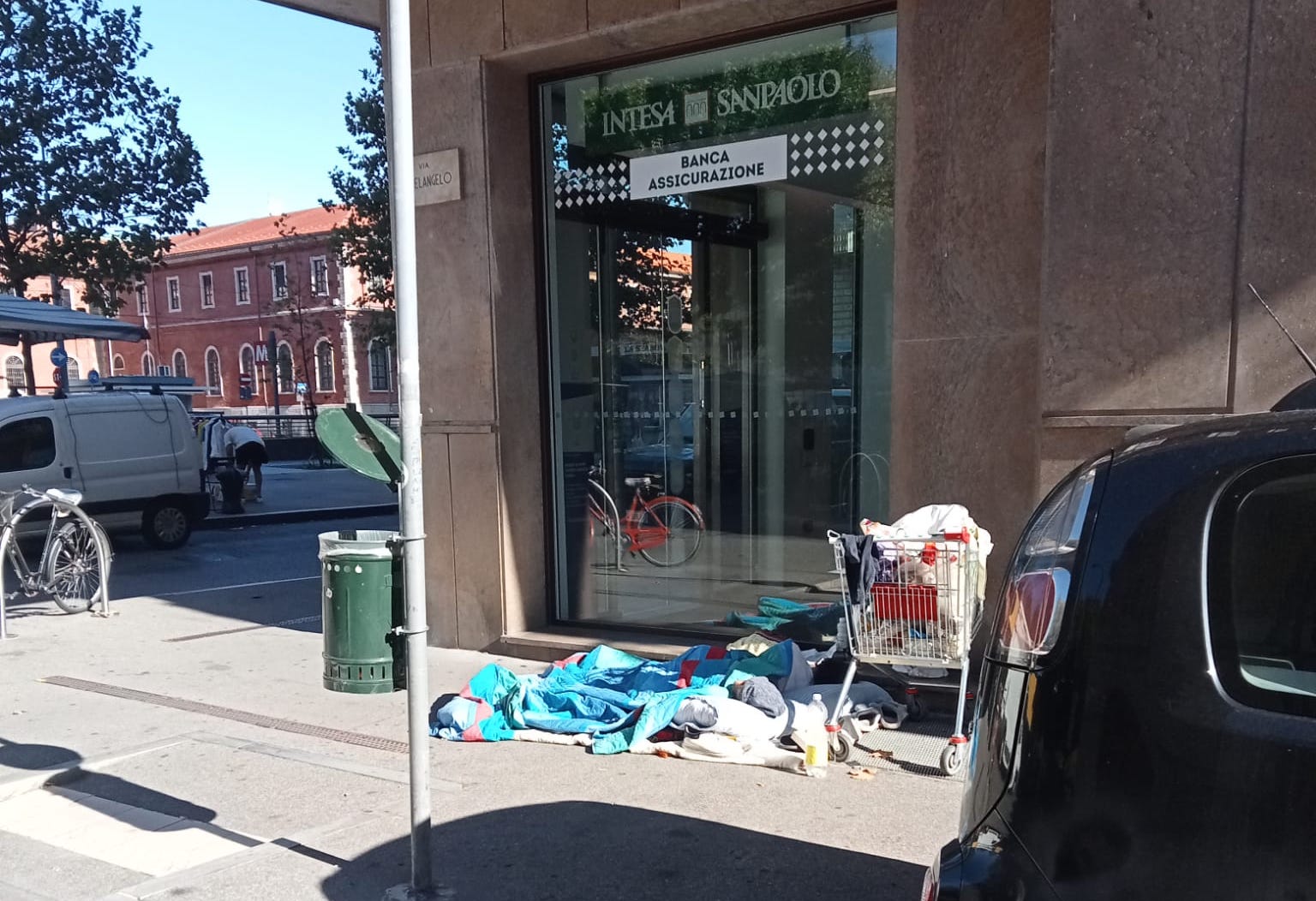 Via Michelangelo, angolo piazza Nizza. È qui che questa mattina la nostra amica reporter Giusi ha scattato la foto che ci ha inviato, ritraendo la scena di due persone – un uomo e una donna – addormentate sotto le vetrine di una filiale Intesa Sanpaolo.