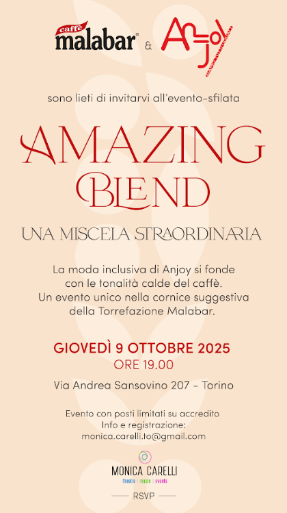 La moda inclusiva di Anjoy si tinge delle calde sfumature del caffè Malabar in un evento unico che si terrà giovedì 9 ottobre a Torino, nella suggestiva cornice della storica torrefazione in via Andrea Sansovino 207.