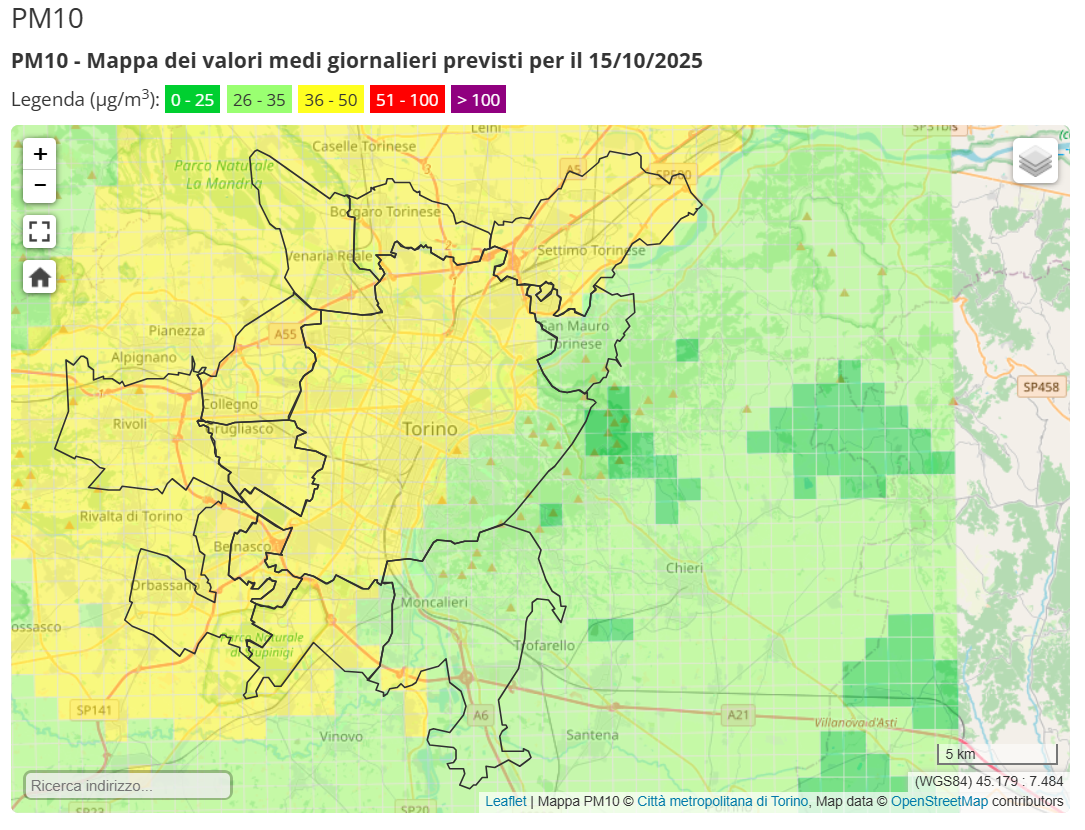 Per esempio, oggi 15 ottobre 2025 la qualità dell’aria a Torino è risultata “Accettabile” (3), indicando che le concentrazioni di inquinanti si avvicinano ai valori limite per la tutela della salute.