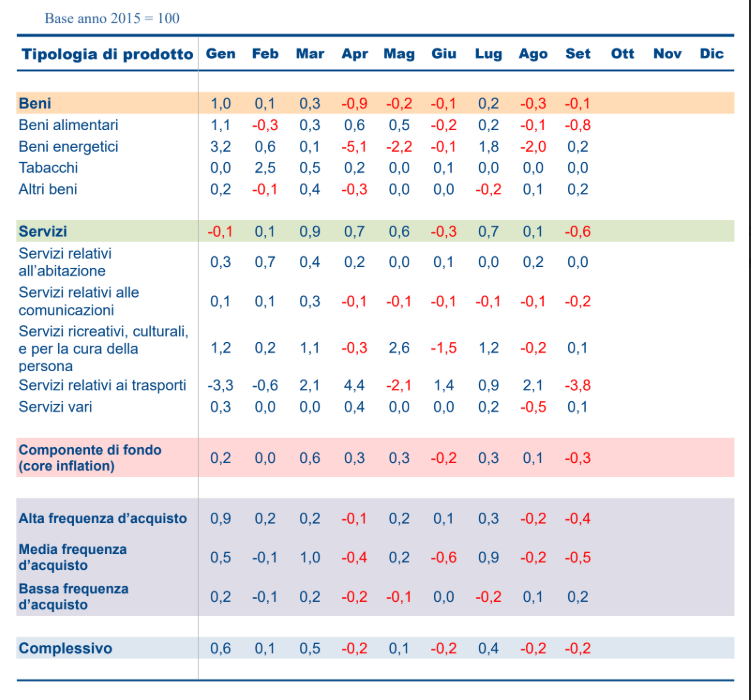 Guardando alle categorie principali, i beni hanno subito una lieve contrazione dello 0,1% su base mensile, ma sono cresciuti dello 0,7% su base annua. Tra questi, vi sono variazioni specifiche importanti: i beni alimentari risultano in calo dello 0,8% rispetto al mese precedente, ma in aumento del 3,1% rispetto all’anno precedente. I beni energetici, invece, hanno mostrato un piccolo aumento dello 0,2% rispetto ad agosto, ma una diminuzione significativa del 2,8% rispetto a settembre 2024. I tabacchi sono rimasti stabili nel confronto mensile (0%), con un aumento annuo del 3,2%. Anche gli altri beni mostrano un lieve aumento dello 0,2% rispetto al mese precedente e dello 0,4% rispetto all’anno precedente.