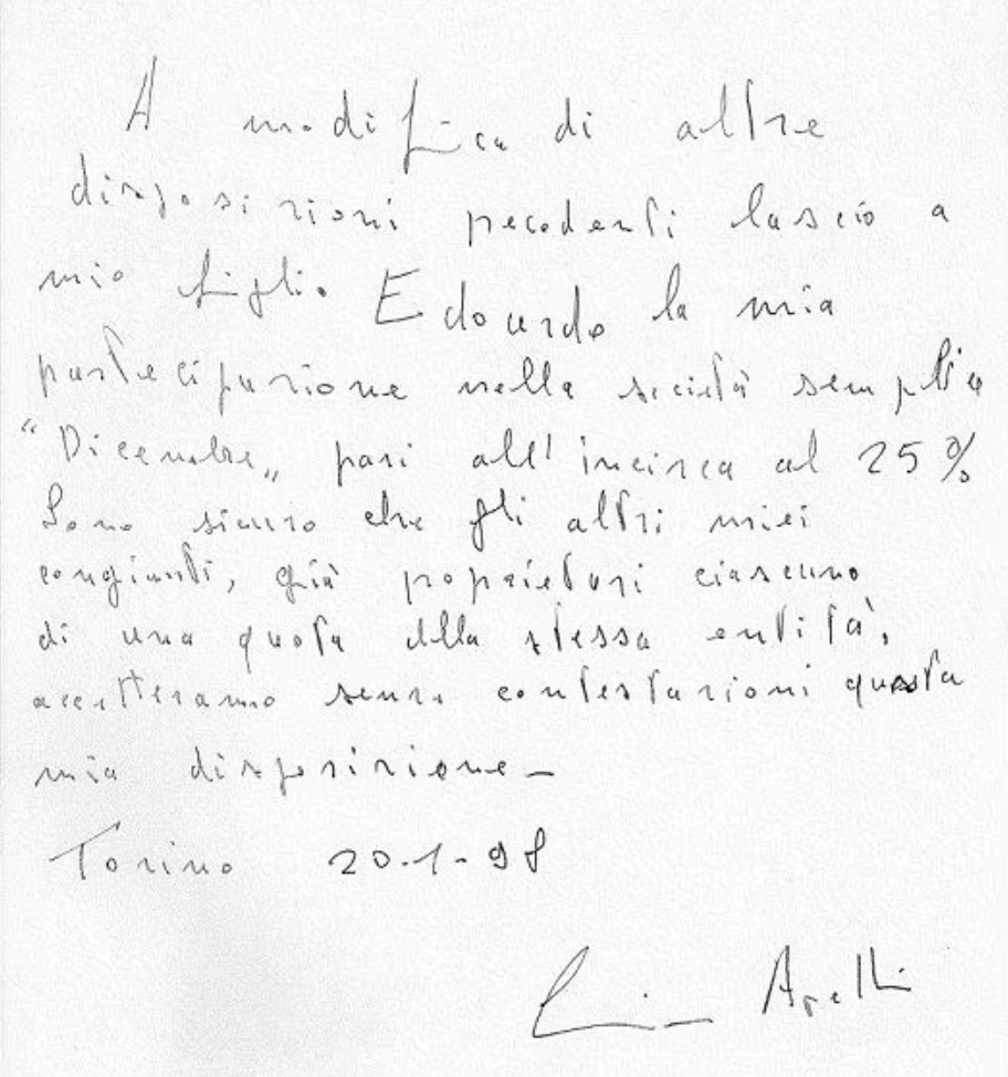 Forse Gianni Agnelli non volle mai consegnarsi al linguaggio notarile. Forse pensava che bastasse il sistema che aveva costruito: uomini fedeli, consiglieri esperti, una rete di potere intrecciata alla sua persona.