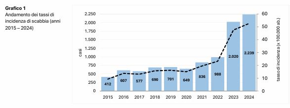 In totale, in Piemonte, nel 2024 sono stati registrati 2.239 casi di scabbia, con un tasso di incidenza pari a 53 casi ogni 100mila abitanti, e 267 focolai, di cui circa 83 in ambito comunitario e il 70% di origine familiare. La crescita rispetto al 2023 è stata lieve (219 casi in più) ma basta dare un’occhiata ai dati degli anni precedenti per capire che ci troviamo di fronte a una vera e propria impennata: nel 2022 i casi erano 988, nel 2021 erano 836, nel 2020 addirittura solo 649. E se i dati del 2020 e del 2021 potevano in qualche modo essere “falsati” dai lockdown dovuti alla pandemia di Covid (la scabbia si propaga con il contatto personale) altrettanto non si può dire per il 2022.