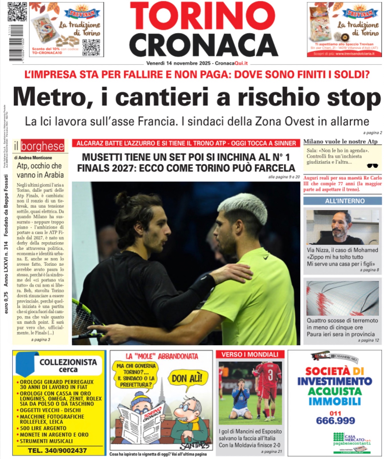Cronaca nera, cronaca bianca, sport, tempo libero. Come sempre, tante notizie da Torino e dalla provincia. Oggi in particolare potrete leggere - tra le altre cose - gli approfondimenti sul rischio dello stop ai cantieri della metropolitana, tutto sulle Atp Finals, quanto costano al Comune di Torino i risarcimenti per i danni causati dalle buche in strada, la storia di una delle famiglie che ha perso la casa nell'esplosione causata da un innamorato respinto, i nuovi guai di Don Alì il "re dei maranza", una bella intervista ad Andrea Roncato, le nostre rubriche, le lettere al direttore i giochi enigmistici e tanto altro ancora.