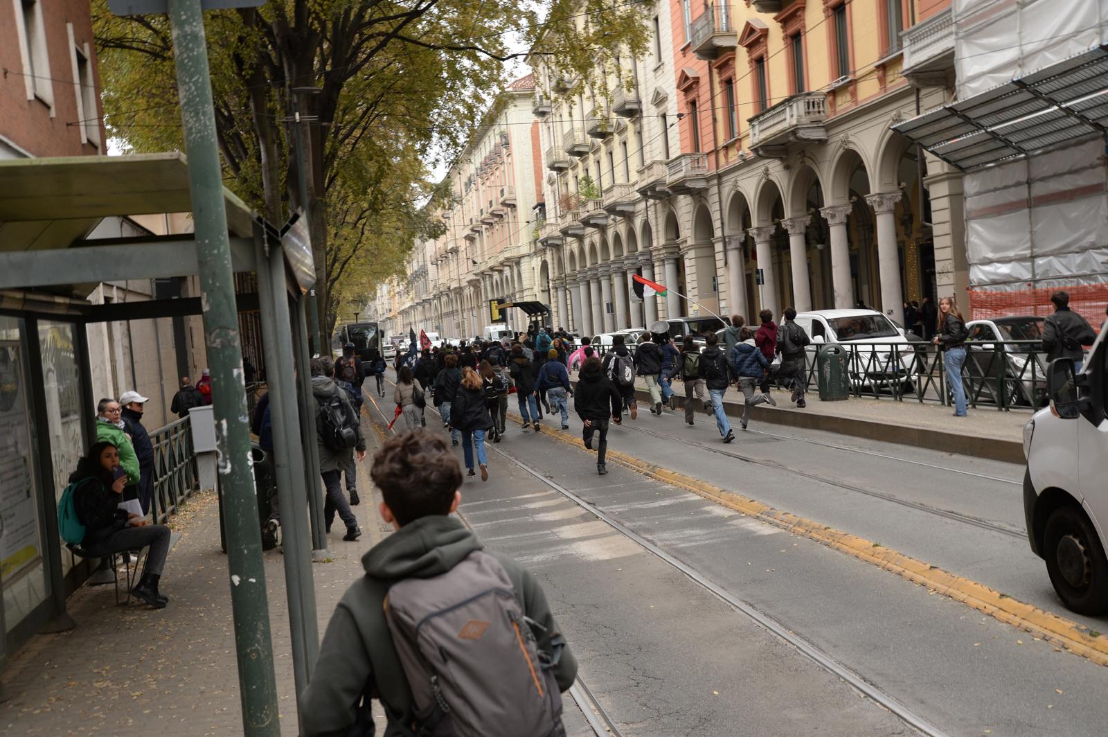 Un migliaio di studenti in marcia da Torino nel giorno dello sciopero, oggi, venerdì 14 novembre. Dietro lo striscione che recita: "Contro il governo del genocidio e dello sciopero, gli studenti bloccano tutto", i manifestanti sono partiti da piazza XVIII Dicembre per sfilare in corteo. Porta Susa, dopo gli scontri delle ultime manifestazioni, è blindata con gli accessi da corso Bolzano chiusi e presidiati dal Reparto mobile della polizia.
