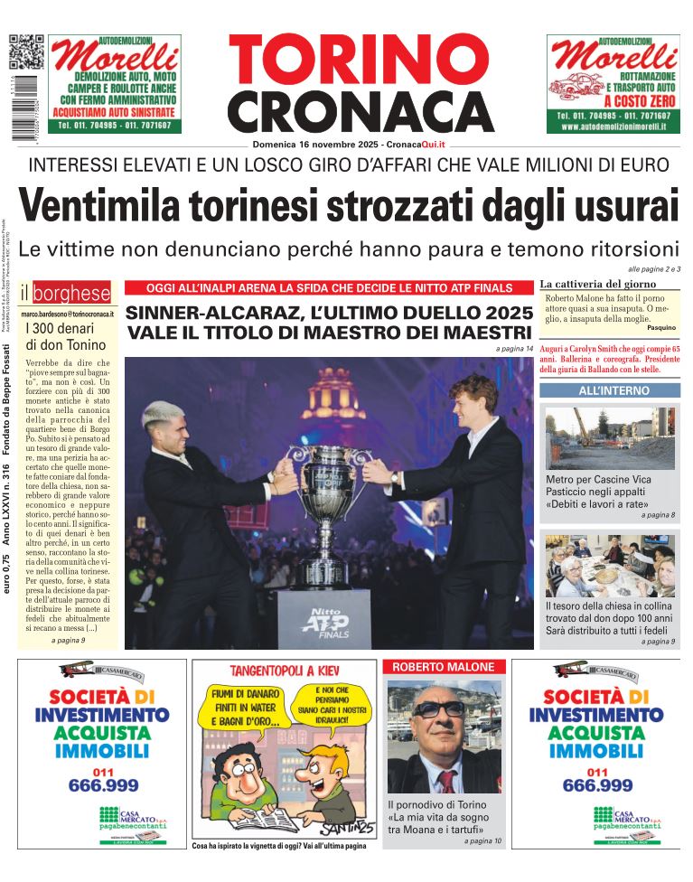 Cronaca nera, cronaca bianca, sport, tempo libero. Come sempre, tante notizie da Torino e dalla provincia. Oggi in particolare potrete leggere - tra le altre cose - gli approfondimenti sul fenomeno dell'usura nel Torinese, gli ultimi aggiornamenti sul rischio stop dei cantieri della linea 1 della metropolitana, una curiosa intervista al pornodivo Roberto Malone, tutto sulle Atp Finals e su Sinner, le nostre rubriche, le lettere al direttore, i giochi enigmistici e tanto altro ancora.