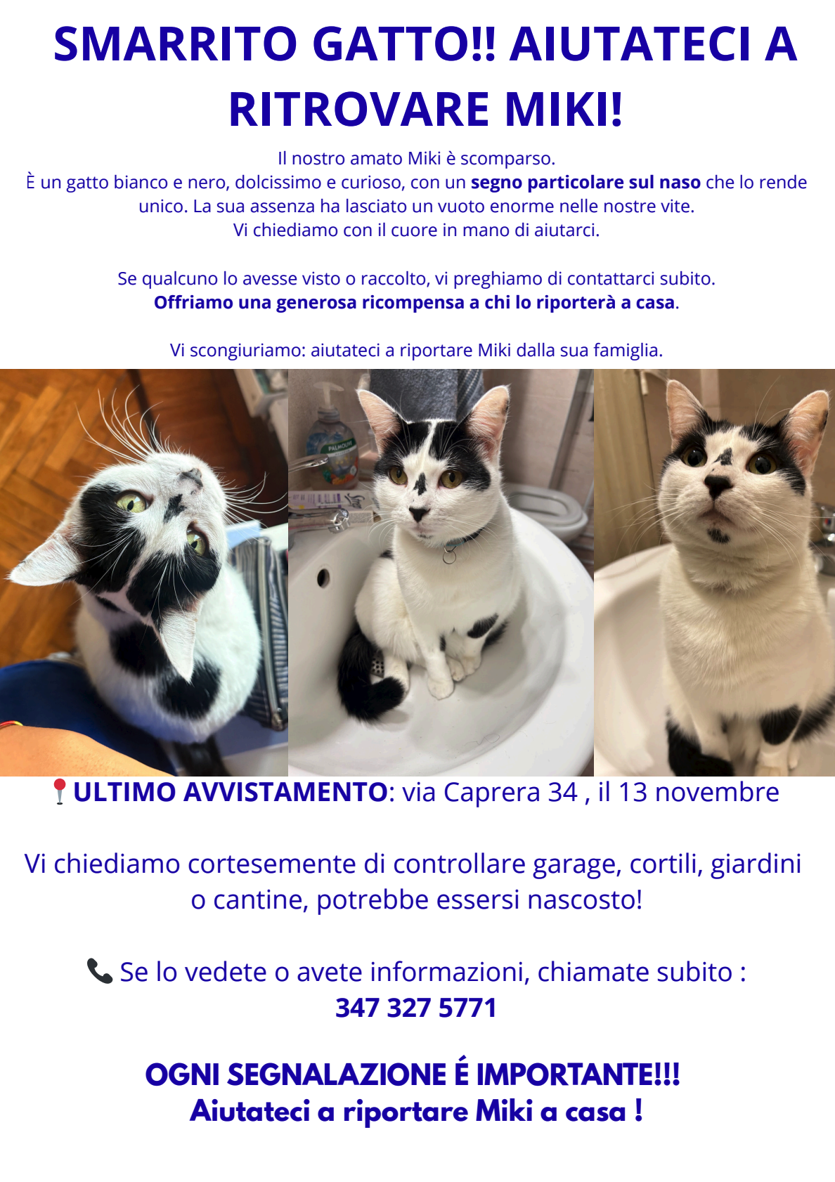 Potrebbe essersi nascosto in qualche garage, cortile, giardino o cantina della zona. in caso di avvistamento o informazioni sul piccolo Miki chiamare subito il numero 347 327 5771. Ogni segnalazione è importante e può aiutare Miki a tornare a casa, tra le braccia di chi lo ama.